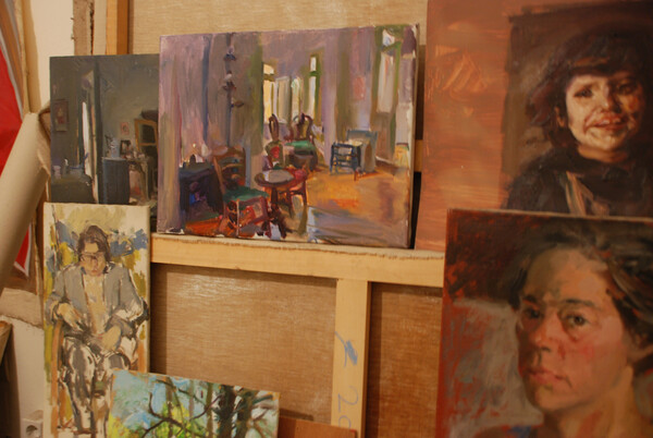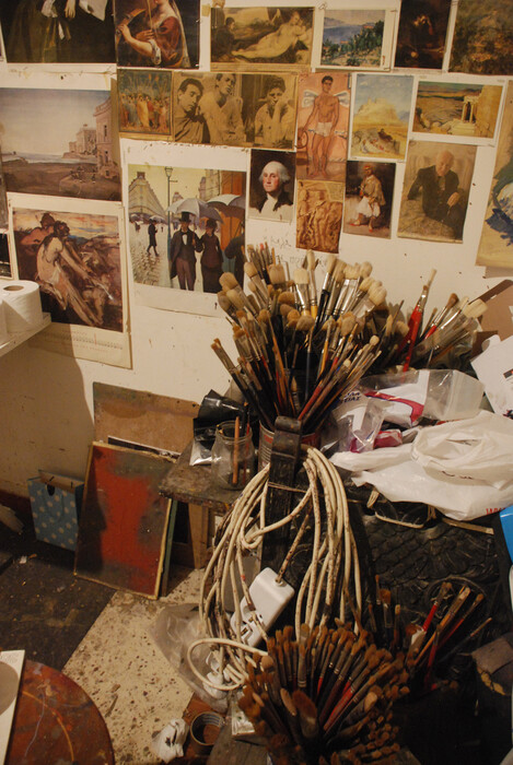 «Υπάρχουν ατελιέ που είναι αψεγάδιαστα, τακτικά, όπου τα μολύβια είναι τοποθετημένα το ένα δίπλα στο άλλο ‒ σε αυτήν τη συγκεκριμένη εργασία αφιερώνεται χρόνος κάθε μέρα, ώστε όταν τελειώνει η εργασία να τακτοποιούνται. Το θέμα είναι ποια είναι η ιδιοσυγκρασία του καλλιτέχνη και πώς αυτή αποτυπώνεται στον χώρο του. Διατηρούμε με τον σύζυγο μου φιλία πολλών ετών με τον Στέφανο Δασκαλάκη, το ατελιέ του οποίου επισκέπτομαι πάνω κάτω επτά χρόνια. Όποτε πηγαίνω, τρελαίνομαι, τραβάνε την προσοχή μου εικόνες, σχήματα, κομματάκια από σελοτέιπ στο πάτωμα που είναι σαν να σχηματίζουν πίνακες κι ας μην είναι μορφές, μου φαίνονται όλα πανέμορφα.