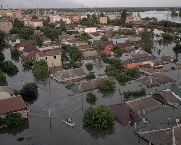 Η πλημμυρισμένη περιοχή της Χερσώνας τραβήχτηκε από ένα πολυώροφο κτίριο, 7 Ιουνίου 2023. Στις 6 Ιουνίου 2023, εκρήξεις προκάλεσαν ζημιές στο τοίχωμα του ελεγχόμενου από τη Ρωσία φράγματος Kakhovka στη νοτιοανατολική Ουκρανία, προκαλώντας εκτεταμένες πλημμύρες στη Χερσώνα. Το ρήγμα κατέκλυσε πλήρως περίπου 17.500 σπίτια τόσο στην ελεγχόμενη από την Ουκρανία δυτική όχθη όσο και στην ελεγχόμενη από τη Ρωσία ανατολική όχθη του ποταμού, σκοτώνοντας εκατοντάδες ανθρώπους. Οι αρχές εκτίμησαν ότι περισσότεροι από 40.000 άνθρωποι θα πρέπει να απομακρυνθούν.