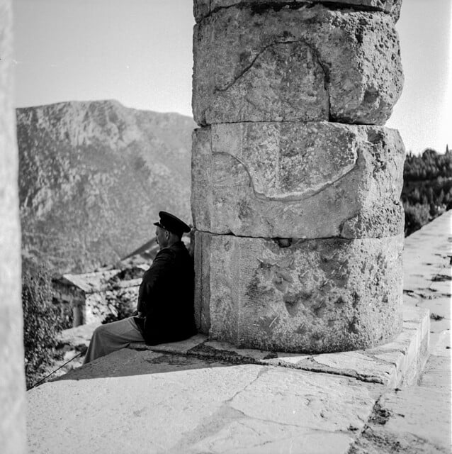 O φωτογράφος Παύλος Γερακίνης στην Ιερά Οδό των Δελφών, 1955.