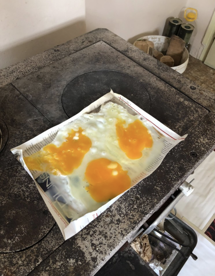 Frying pan, Folded newspaper, Location unknown, Nadia Todorova