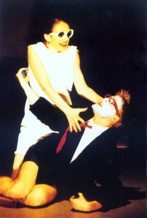 Η διάσημη πια μαύρη κωμωδία με τη σουρεαλιστική πλοκή, τις ιδιοφυείς ανατροπές και τις βιτριολικές ατάκες είχε τη μεγάλη τύχη να ανέβει στη Θεσσαλονίκη σε μια πραγματικά ανατρεπτική και ιλιγγιώδη παράσταση από τη νεανική ομάδα Νέες Μορφές και τον ευρηματικό σκηνοθέτη Γιάννη Παρασκευόπουλο. Σε έναν υπόγειο χώρο της οδού Αγνώστου Στρατιώτη, παρόδου της Αγίου Δημητρίου, πάνω από την Αρχαία Αγορά, ξαφνικά έβλεπες ουρές από νέους ανθρώπους. Ήταν φανερό ότι διψούσαν για κάτι φρέσκο που θα εξέφραζε την εποχή τους. Οι φρενήρεις ρυθμοί, τα μουσικά δρώμενα, η υπέρβαση λόγου, φόρμας και αισθητικής πιστοποιούσαν αυτό που εν τέλει δεν άφησε ασυγκίνητες ούτε τις μεγαλύτερες ηλικίες θεατρόφιλων Σαλονικιών, που επίσης έσπευσαν να το δουν. Παράσταση συνόλου με ερμηνευτές τον χορογράφο Κώστα Γεράρδο, τη Μαγδαληνή Μπεκρή, τη Λαμπρινή Αγγελίδου και τον Χρήστο Πασσαλή στην πρώτη του εμφάνιση. Το σκηνικό της Σοφίας Παπαδοπούλου παρέπεμπε στα κόμικς, όπως και τα ευφυή κοστούμια των Βασίλη Μπαρμπαρίγου (ο ενδυματολόγος αργότερα της «Στρέλλας» και του «Ξενία» του Κούτρα) και Ανδρέα Παρασκευόπουλου, ενώ οι χορογραφίες ήταν της Αναστασίας Θεοφανίδου.