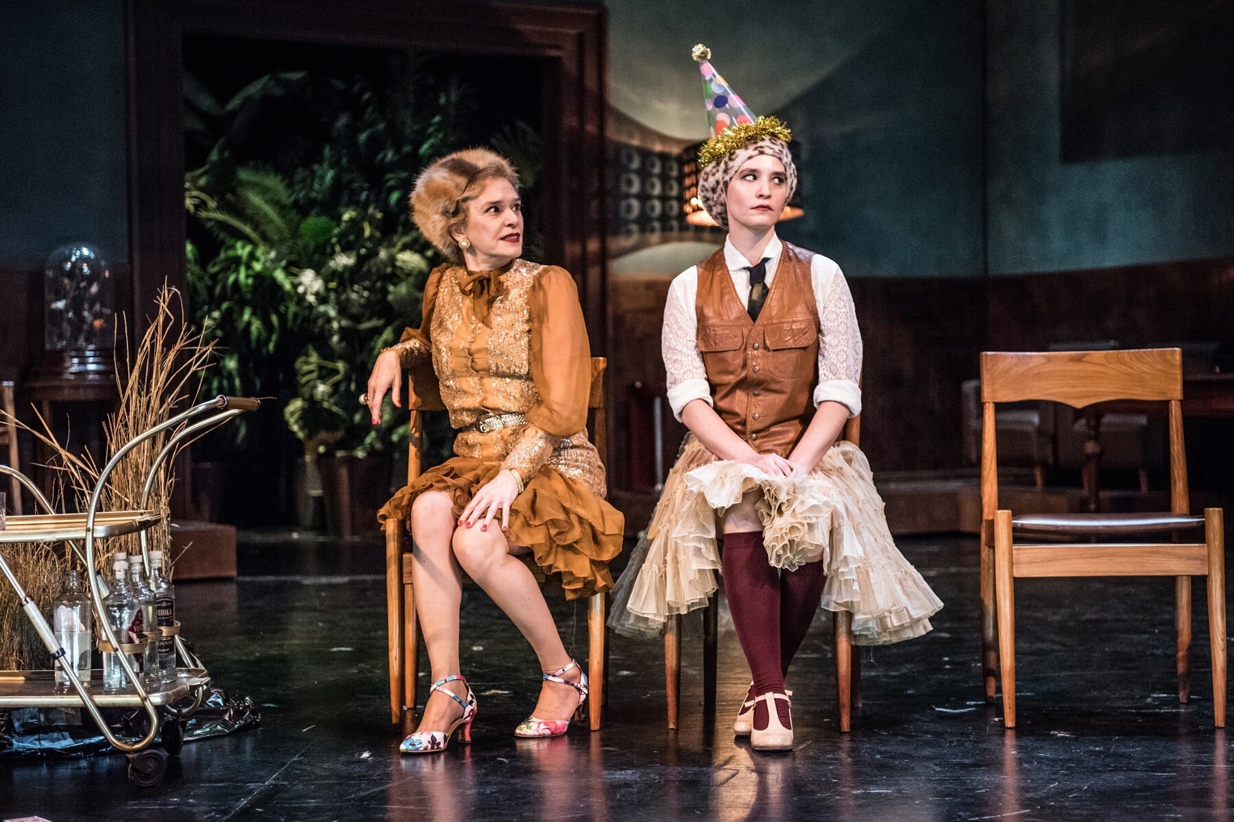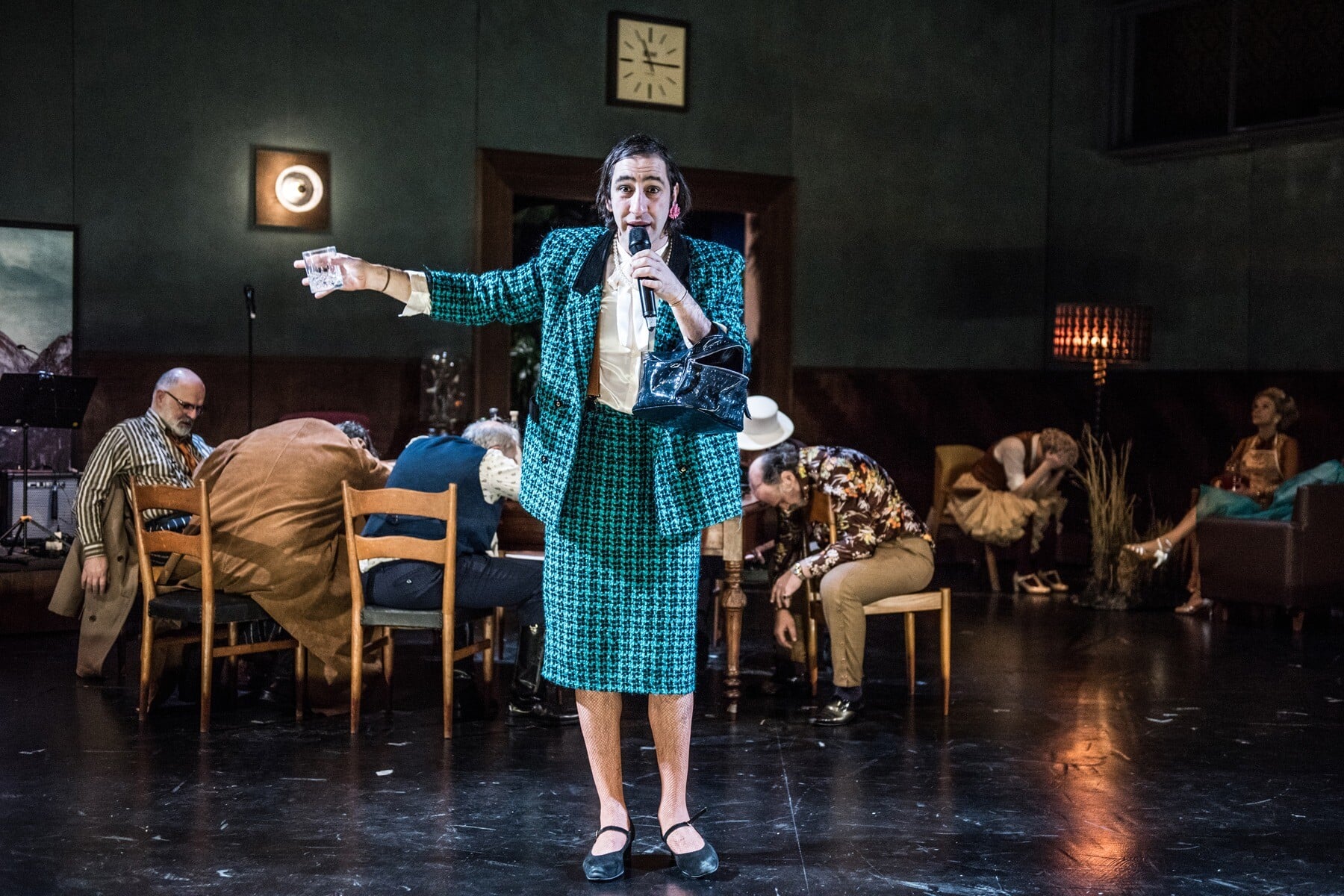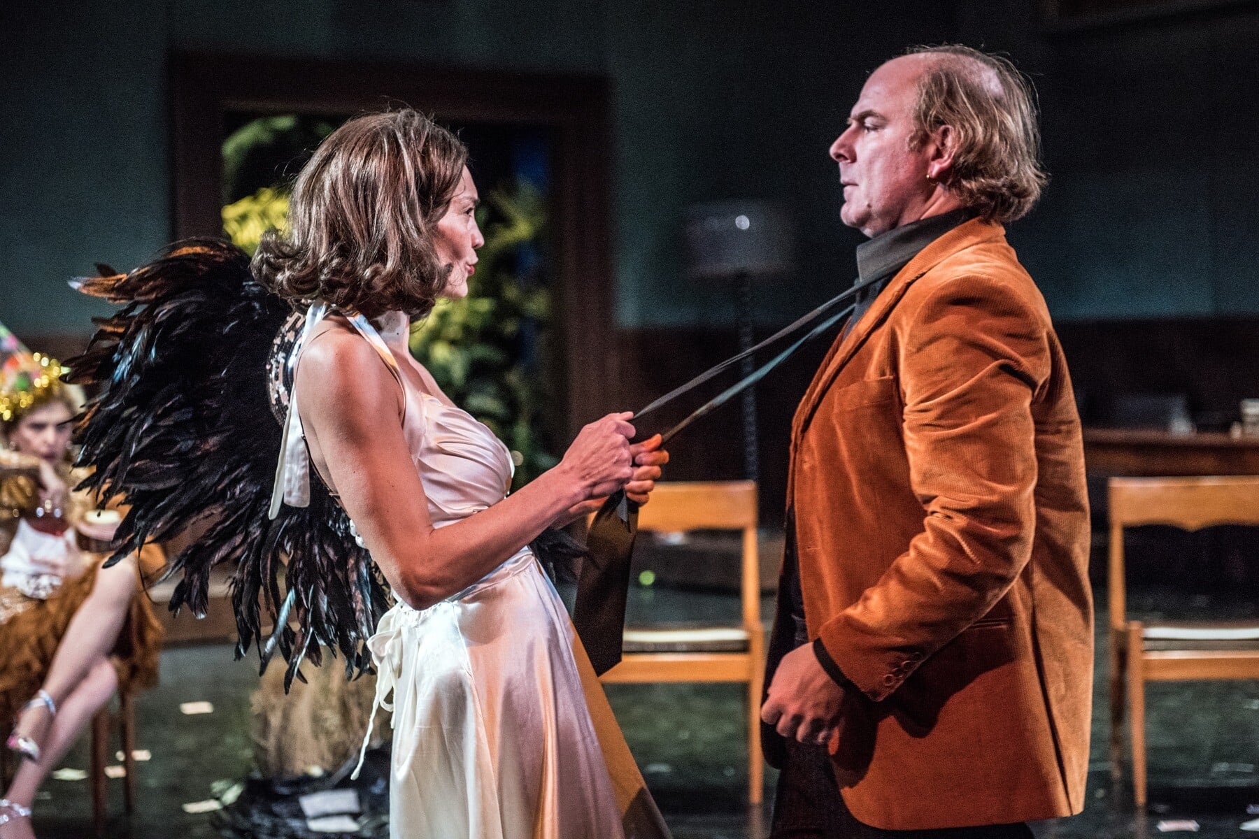 Πράγματι, η ελικοειδής περιπλάνησή μας ανάμεσα στις πόζες και τις κλοουνερί που εκτυλίσσονται ενώπιόν μας σύντομα βρίσκεται αιχμαλωτισμένη σε μια ατέρμονη, εξαντλητική λούπα. Δεν είναι μόνον ο μάλλον κοινότοπος τρόπος με τον οποίο σκιαγραφούνται οι καλεσμένοι και η πλήξη τους: μεθυσμένοι που σκουντουφλάνε, φούστες που ανασηκώνονται, λόξιγκες, σουρσίματα, ψευτο-φλερτ και επιφωνήματα. Είναι και ότι αυτή η πινακοθήκη από καρικατούρες που στήνεται ενώπιόν μας δεν καταφέρνει να παρουσιάσει περσόνες ενδιαφέρουσες, ή έστω αρκούντως ερεθιστικές. Είναι όλες ασχημάτιστες ή μισοσχηματισμένες, τα «νούμερά» τους, ειδικά αυτά που εκτελούνται στο προσκήνιο, άνευρα, δίχως ταυτότητα, δίχως θεατρική γοητεία.