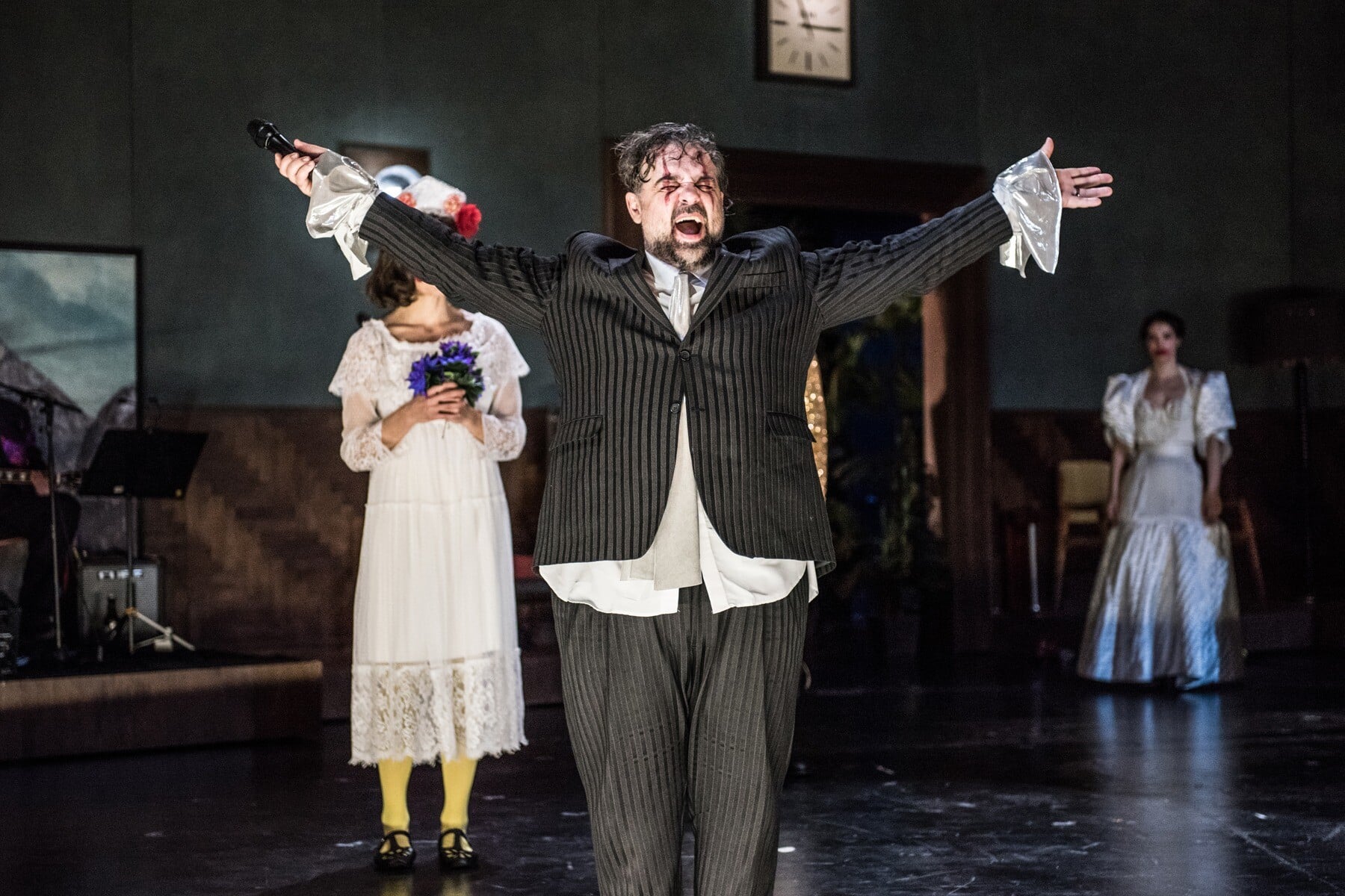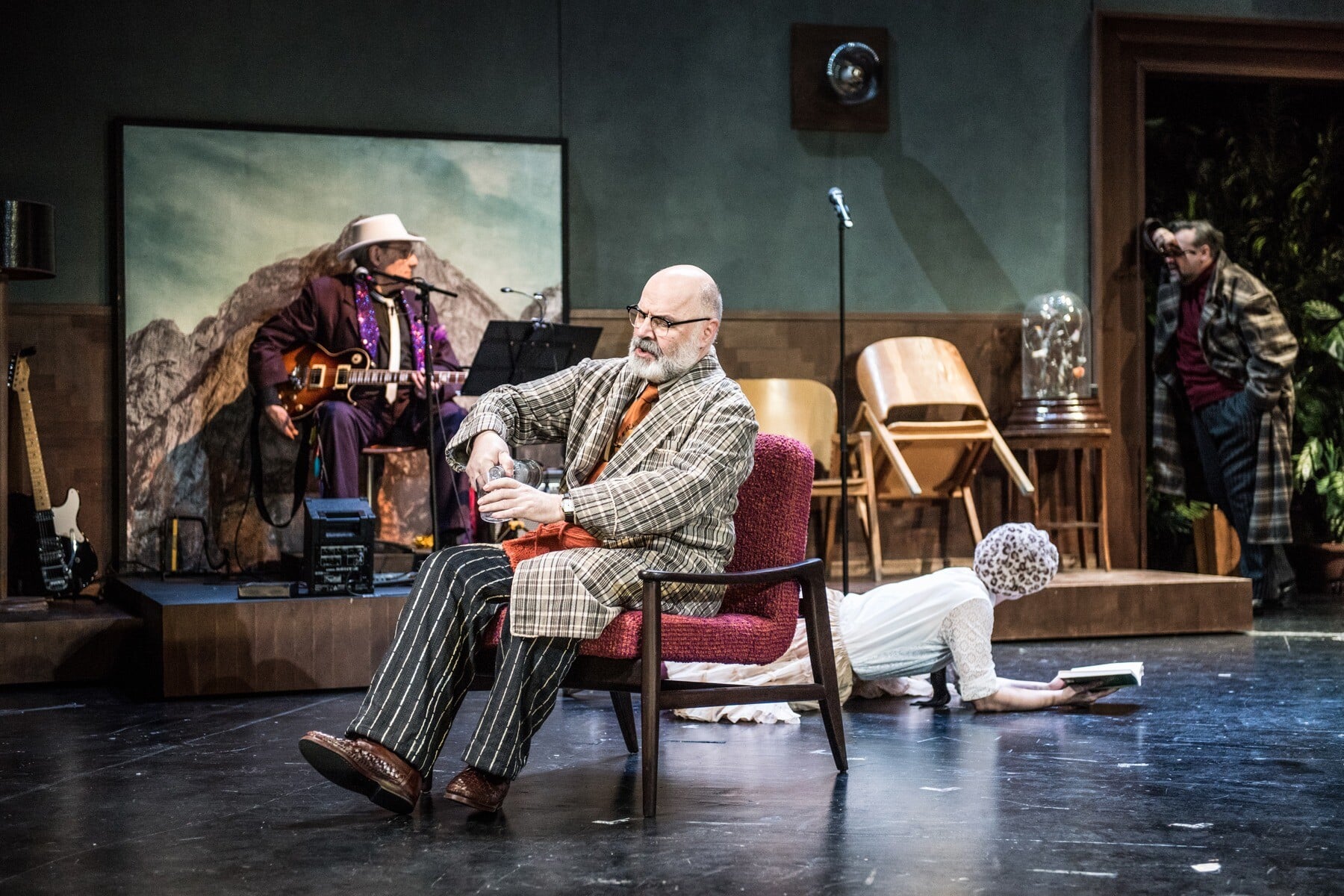 Εγκλωβισμένοι όλοι μαζί, ο καθένας με το δικό του gestus, διασκορπισμένοι στα έπιπλα και στις γωνίες, οι ήρωες υφαίνουν από κοινού έναν ιστό παραίτησης, νεύρωσης και ανίας. Η Σάσα διαβάζει στο πάτωμα, ο πατέρας της πλέκει ένα πουλόβερ, ο κόμης Σαμπέλσκι έχει κουλουριαστεί μ’ ένα ποτήρι βότκα, η Αβντότια Ναζάροβνα ρίχνει επικριτικές ματιές γραπώνοντας το τσαντάκι της, ο Ιβάνοφ μελετάει τις υποθέσεις του καθισμένος στο γραφείο του, ο Μπλέιν Ρέινινγκερ πίνει μπίρες και τραγουδά μπαλάντες φορώντας ένα καουμπόικο καπέλο, ενώ η Άννα Πέτροβνα παρακολουθεί τα πάντα από ψηλά, τρεμάμενη μες στο λευκό κομπινεζόν της.