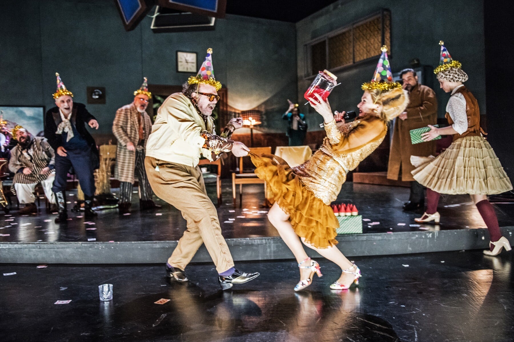 Το σκηνικό και η διάθεση έχουν τεθεί. Λίγο αργότερα, η μετωπική παράταξη των καθισμάτων θα σημάνει την έναρξη της δεξίωσης για τα γενέθλια της Σάσας και τη συνεπακόλουθη μετατροπή του πεδίου σε πίστα «τσίρκου». Οι καλεσμένοι θυμίζουν τώρα κλόουν-διασκεδαστές, με ή χωρίς περούκα, που κάνουν ό,τι μπορούν για να πατάξουν την πλήξη και τη θλίψη τους: ένας ατέρμονος βόμβος σχολίων –κολακευτικών ή προσβλητικών–, χειρονομιών –άσεμνων ή ευγενικών–, γέλιων και κακαρισμάτων, χασμουρητών, ακκισμών και στροβιλισμών μάς καταπίνει.