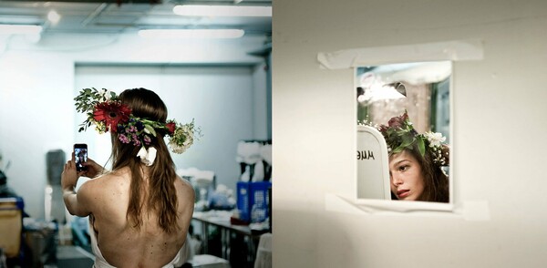 «Οι ηθοποιοί προτιμούν να ξεκουράζονται στη σκηνή παρά στα κρεβάτια που τους παρέχουμε» μας λέει ο υπεύθυνος οργάνωσης της παραγωγής Σεμπάστιαν Πέετερς. Ανησυχούν, μας λέει, μήπως δεν ξυπνήσουν και χάσουν τη σειρά τους στη λίγη ώρα ξεκούρασης που έχουν στη διάθεσή τους. Συναντήσαμε τον Σεμπάστιαν για να ρίξουμε μια ματιά στα παρασκήνια της περφόρμανς. Καλλυντικά και υλικά μακιγιάζ, φρούτα, γλυκά, λουλούδια, μαγειρεμένο φαγητό, βιταμίνες και μέλι, κούπες γεμάτες καφέ και τσάι, βούρτσες και χτένες μαλλιών, δεκάδες φιάλες με λακ και σελίδες με μονολόγους βρίσκονται πάνω στα τραπέζια της παραγωγής. Κάποιοι παίρνουν μια ανάσα πριν μπουν για ένα γρήγορο ντους, γι' άλλους είναι ώρα για μια σέλφι, ενώ ορισμένοι τσεκάρουν τις τελευταίες λεπτομέρειες πριν βγουν ξανά στη σκηνή. Μας δείχνει τους χώρους ξεκούρασης και φαγητού αλλά και το ψυγείο όπου αποθηκεύουν τα περίφημα κομμάτια κρέατος που χρησιμοποιεί κατά κόρον ο Φαμπρ στην περφόρμανς. «Δεν είναι οποιοδήποτε κρέας» μου λέει ο Νίκος από τη διοργάνωση των Δημητρίων και μου δείχνει τη λίστα με τα περίπου 200 κιλά από χοιρινούς πνεύμονες, καρδιές, γλώσσες κ.ά. που παρήγγειλε ο σκηνοθέτης. Τίποτε απ' ό,τι βγαίνει στη σκηνή δεν είναι τυχαίο, ακόμη και τα χρώματα των φυτών έχουν κάποιον συμβολισμό, μου λένε. Πλησιάζουμε τη Γαλλίδα ηθοποιό Ανί Τζουπέρ για να τη ρωτήσουμε πώς αντεπεξέρχεται στις απαιτήσεις της παράστασης. «Το βουνό είναι πολύ μεγάλο για να το ανέβουμε. Δεν ξέρω πώς τα καταφέρνουμε κάθε φορά. Ο καθένας μας είναι σαν ήρωας» μας λέει. «Είναι πολύ σημαντικό για εμάς που είμαστε τόσο κοντά στον Όλυμπο. Θα επισκεφθούμε και την περιοχή τις επόμενες μέρες» μας λέει και η σημασία της διοργάνωσης μεγεθύνεται από το γεγονός ότι ο Φαμπρ δέχτηκε να φέρει την παράσταση στη Θεσσαλονίκη χωρίς αμοιβή, παρά μόνο με την κάλυψη των εξόδων παραγωγής.