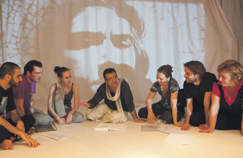 Τ.Τ.: Ο ίδιος. Σηματοδοτεί ότι είναι ένας ήρωάς του. Λέει όμως ότι καταρχάς τον αφορά ο άνθρωπος. Τους Χτίστες τούς έγραψε με αφορμή έναν ταξιτζή. Μέσα από πολλές επεξεργασίες, μέσα από ένα παλίμψηστο, ο ταξιτζής γίνεται ο κήρυκας. Προσπάθησα μέσα από τη διαδικασία που ακολουθήσαμε να δω τι σημαίνει ο λόγος για καθέναν από τους έξι ηθοποιούς, που είναι έξι ερημιές, έξι μοναξιές, που προς το τέλος του έργου συναντιούνται.