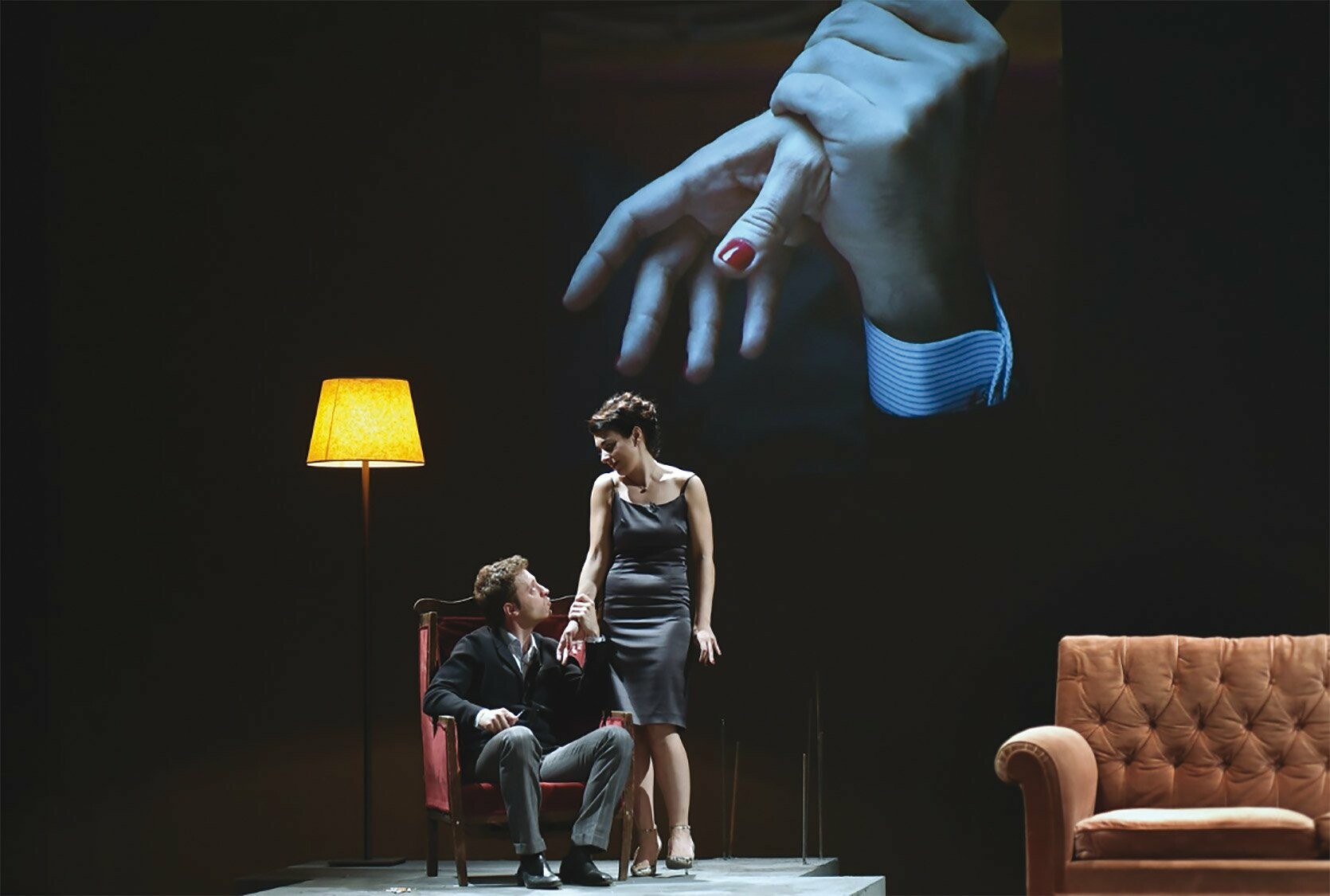 Μερικά συμβολικά αντικείμενα –ένα φωτιστικό-φεγγάρι, μια μυστηριώδης και φωνακλού κουκουβάγια-ρομπότ, ένας κήπος με τριαντάφυλλα σε διάφορα στάδια αποσύνθεσης– έρχονταν να συμπληρώσουν την αίσθηση του ανοίκειου. Λεπτομέρειες από τη δράση, από τα πρόσωπα και τα σώματα των ηθοποιών –μια νευρική χειρονομία, ένα στόμα ή ένα μάτι– προβάλλονταν σε μεγέθυνση σε μια οθόνη πίσω από τους ηθοποιούς.