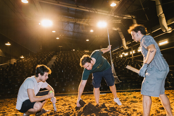 Οι άνθρωποι που ανανεώνουν το χώμα στη σκηνή το στρώνουν προσεκτικά για να μη σηκώσει σκόνη, μετά κάποιος το βρέχει και όλο το σκηνικό μυρίζει φθινόπωρο. Ο Βασίλης Μαγουλιώτης, ένας εκ των τριών πρωταγωνιστών, κάνει τζόγκινγκ και μετά push ups για να χαλαρώσει την ένταση, πριν μπει στο ντους και αλλάξει ρούχα και ζωστεί με τον πομπό και το μικρόφωνο.