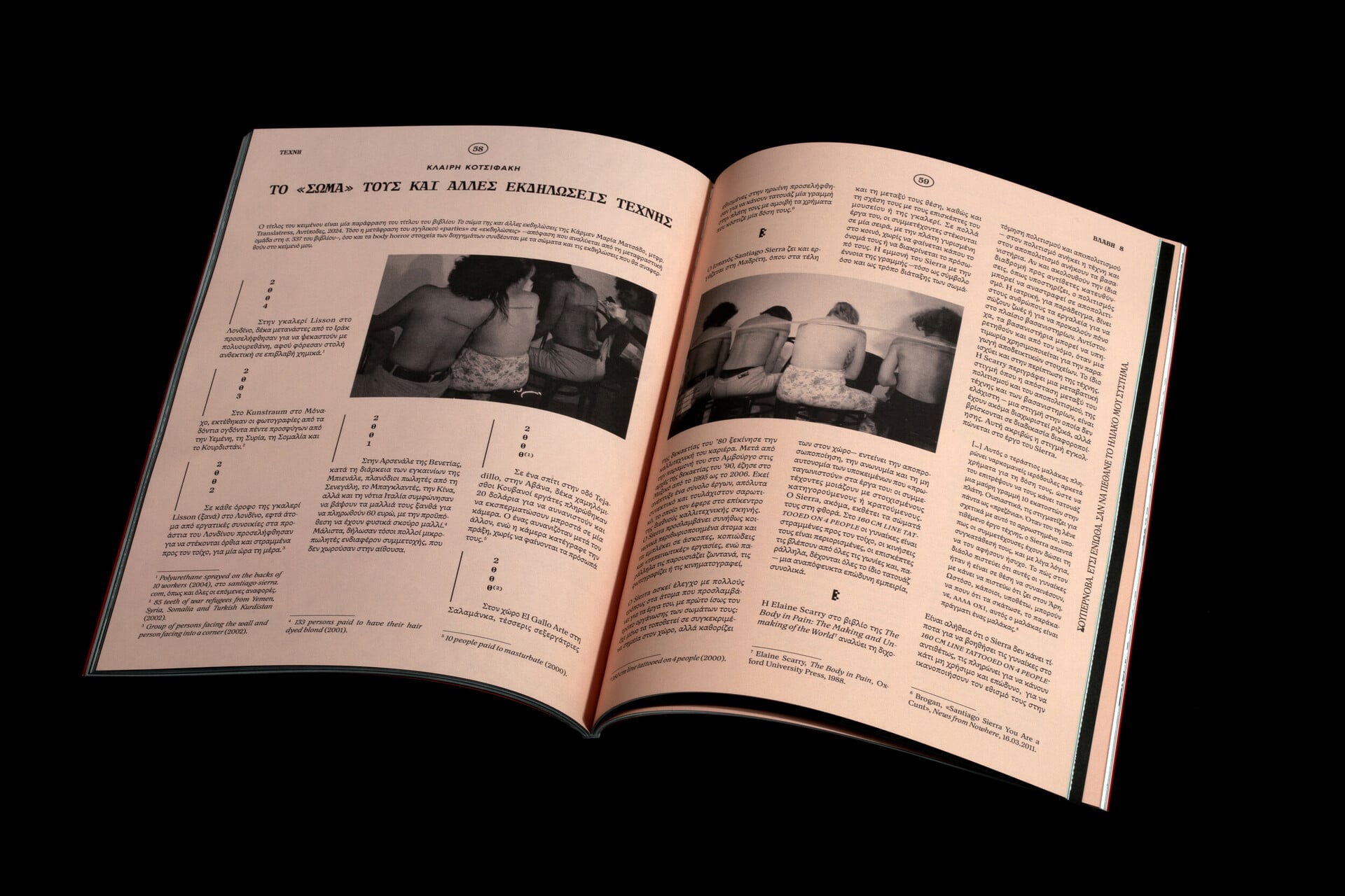 «Όταν ξεκινήσαμε αποφασίσαμε ότι στο εξώφυλλο θα γράφει “περιοδικό για το βιβλίο”», συνεχίζει η Εύα, «ασχέτως του αν τα κείμενα δεν είναι αυτό που θα περίμενε κανείς διαβάζοντας αυτή την “ταμπέλα”: άλλα έχουν έναν αναστοχασμό, μια σύνδεση με την εποχή, σε άλλα το βιβλίο μπορεί να λειτουργεί μόνο ως αφορμή και να φιλοξενούν απόψεις που σίγουρα κάπου τις έχεις διαβάσει, ακόμα κι αν δεν παρατίθεται όλη η βιβλιογραφία, να γράφουν κάποια πράγματα τα οποία αργότερα μπορεί να βρεις σε κάποιο βιβλίο. Υπάρχει αυτή η διαλεκτική πάντα με το βιβλίο ή με τον κινηματογράφο, το θέατρο...