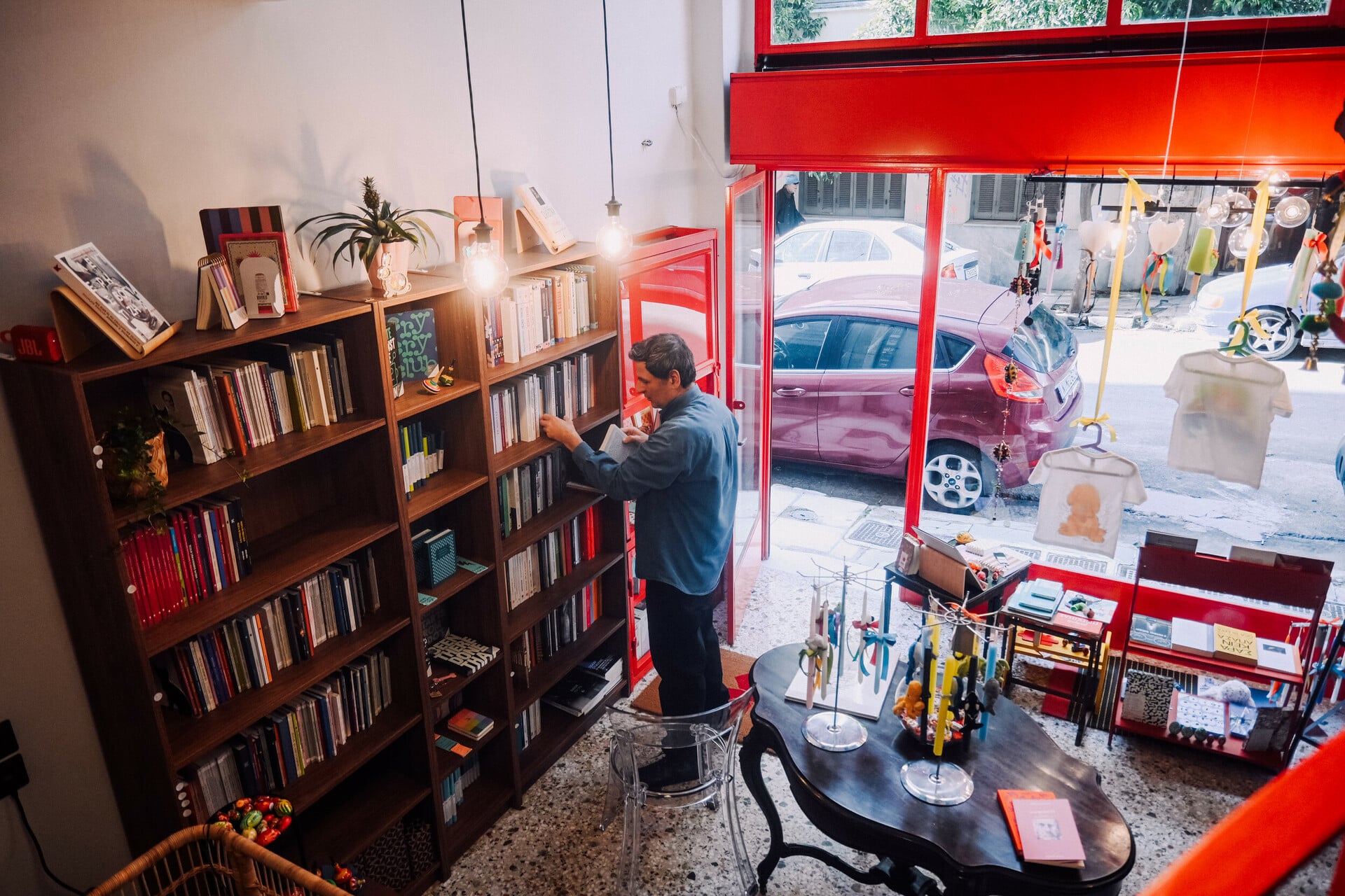 Από το ισόγειο όπου βρίσκομαι, περιτριγυρισμένη από βιβλία, ρίχνω μια ματιά στο πατάρι, όπου μπορεί να ανέβει κανείς από τη σιδερένια κόκκινη σκάλα. Εκεί συναντώ υπέροχα είδη χαρτικών και έναν κόσμο που προορίζεται να ξετρελάνει τα παιδιά, με παιδικά βιβλία και ψαγμένα αντικείμενα, μαζί με τις πασχαλινές λαμπάδες που έχει φτιάξει η ιδιοκτήτρια και κάνουν τους περαστικούς να σπεύδουν να τις προμηθευτούν όση ώρα βρισκόμαστε εκεί.