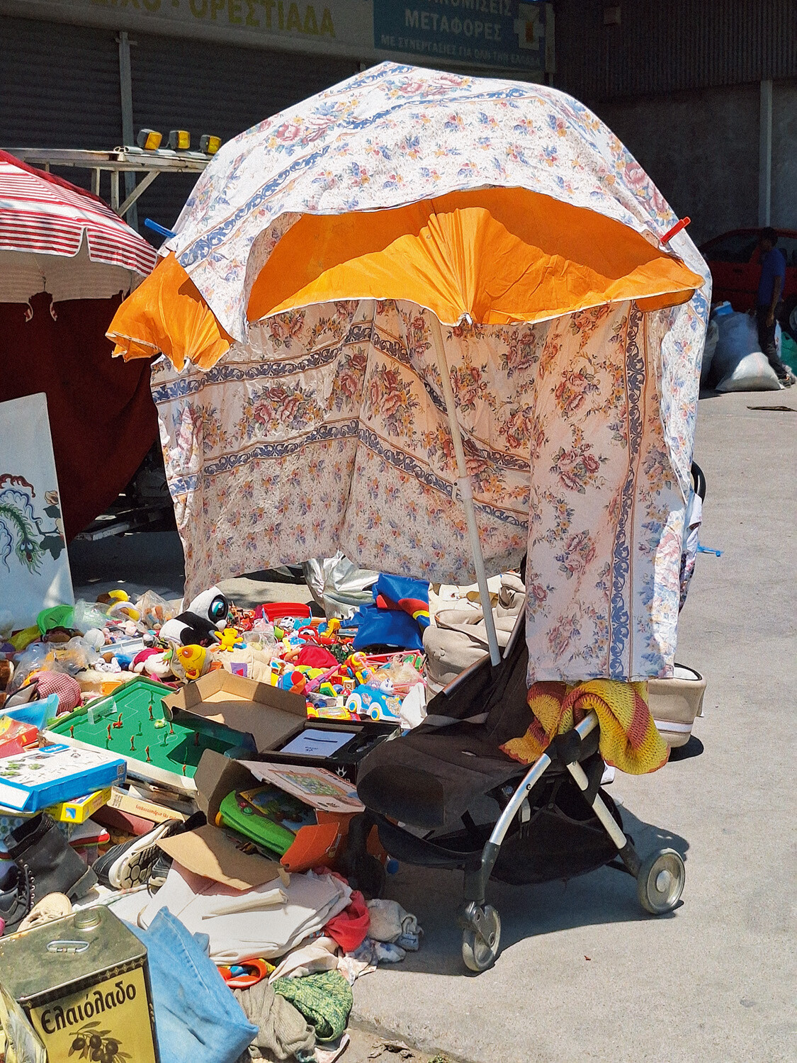 «Πάνε τόσα χρόνια από την πρώτη μου επίσκεψη που δεν θυμάμαι τη συγκεκριμένη μέρα που ήρθα για πρώτη φορά. Θυμάμαι όμως πως από παλιά μου άρεσε να περιπλανιέμαι στην περιοχή του Βοτανικού και του Ελαιώνα. Το παζάρι τότε, πριν ακόμη ασφαλτοστρωθεί η Αγίας Άννης, ήταν πιο χαοτικό. Η ίδια περιοχή που τις καθημερινές είναι πλημμυρισμένη με φορτηγά και σκόνη τις Κυριακές αλλάζει και μοιάζει αχανής, άδεια και περίεργα γοητευτική», μου λέει ο ίδιος ο καλλιτέχνης, και συμπληρώνει: «Θυμάμαι πάντως ότι το πρώτο αντικείμενο που αγόρασα στο παζάρι ήταν μια παλιά έγχρωμη φωτογραφία ενός ερασιτέχνη bodybuilder να επιδεικνύει το γραμμωμένο του σώμα μπροστά στο παιδικό του κρεβάτι, κάπου στην Ελλάδα της δεκαετίας του ’90».