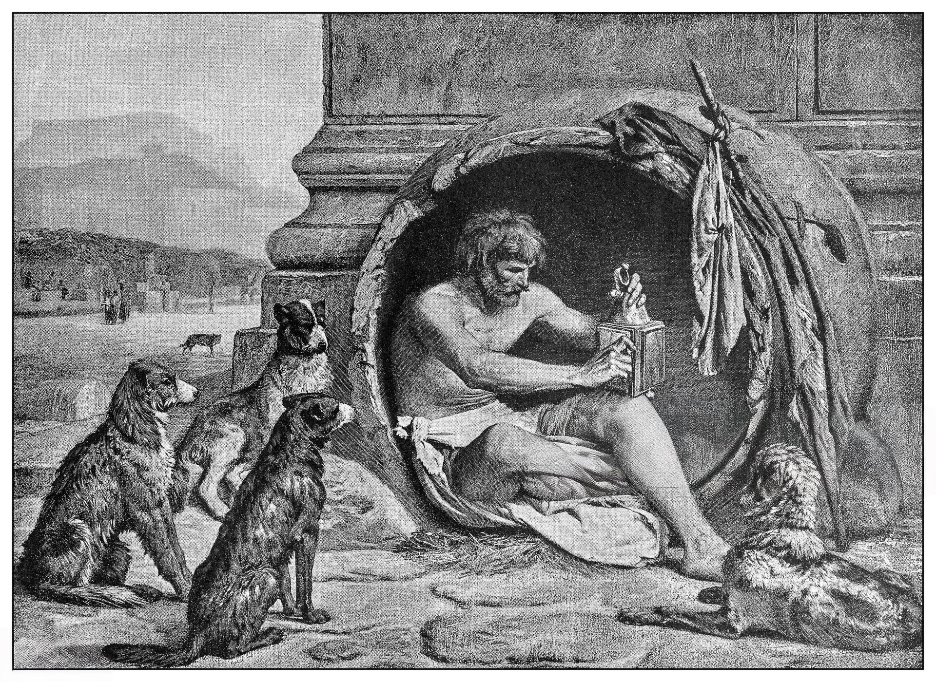 Κάτι ανάμεσα σε άστεγο και αλήτη, δηλητηριώδη κωμικό και performance artist, ο Διογένης επιδείκνυε την περιφρόνησή του για τις συμβάσεις με τρόπους που σκανδάλιζαν την αστική τάξη της Αθήνας και, αργότερα, της Κορίνθου, αφού η εξορία του από τη Σινώπη έγινε μόνιμη. (Όταν ένας αγγελιοφόρος τού ανακοίνωσε ότι οι κάτοικοι της Σινώπης τον είχαν καταδικάσει σε ισόβια εξορία, εκείνος δήλωσε με τη σειρά του ότι τους καταδικάζει να παραμείνουν για πάντα στη Σινώπη). Ήταν στην Κόρινθο, το 330 π.Χ., προς το τέλος της ζωής του, όταν αυτός ο μάστορας των καυστικών σχολίων φέρεται να είπε την πιο αξιομνημόνευτη φράση του, σε μια συνάντηση με τον Αλέξανδρο, τον νεαρό Μακεδόνα μονάρχη που αργότερα θα γινόταν γνωστός ως Μέγας. Ο Αλέξανδρος λέγεται ότι αναζήτησε τον Διογένη, έχοντας ακούσει για τη φήμη του ως σοφού, και τον βρήκε να απολαμβάνει τη λιακάδα δίπλα στο κεραμικό του παράπηγμα. Προσφέρθηκε να του κάνει οποιαδήποτε χάρη ή να ικανοποιήσει οποιοδήποτε αίτημά του. Τότε ο Διογένης φέρεται να του ζήτησε απλώς να κάνει στην άκρη και να σταματήσει να του κρύβει τον ήλιο. Το να μην έχεις ανάγκες ή επιθυμίες, σύμφωνα με την κυνική άποψη, σου έδινε εξουσία μεγαλύτερη από αυτή ενός βασιλιά.