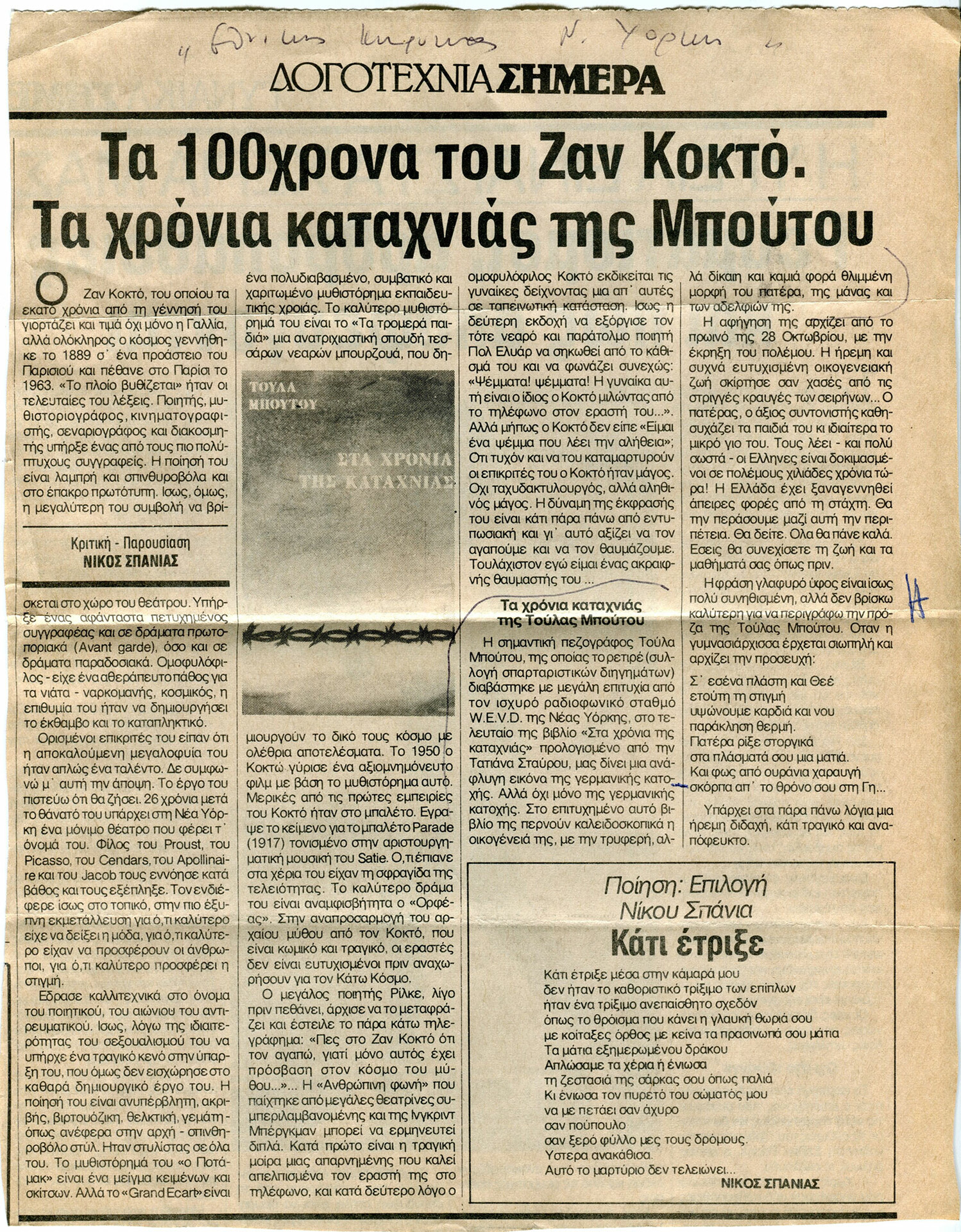 Λίγο καιρό μετά την κυκλοφορία του βιβλίου, η συγγραφέας ειδοποιήθηκε για μία μεγάλη δημοσίευση που της έγινε στην εφημερίδα "Εθνικός Κήρυκας" της Νέας Υόρκης με μία θερμή κριτική από τον Νίκο Σπάνια. Ίσαμε τότε η Μπούτου δε γνώριζε καν το όνομα του ποιητή.