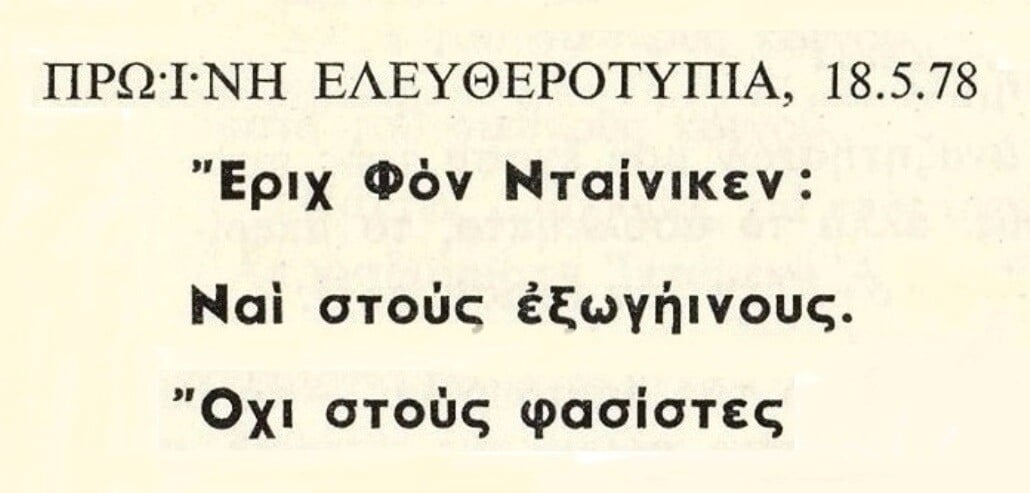 Επίσης, στην «Πρωινή Ελευθεροτυπία» της 18ης Μαΐου 1978 διαβάζουμε: «Έριχ φον Νταίνικεν: Ναι στους εξωγήινους. Όχι στους φασίστες». Ο τίτλος δεν ήταν τυχαίος. Οι νεοφασίστες είχαν αναθαρρήσει στα πρώτα χρόνια της μεταπολίτευσης, είχαν βγει στους δρόμους, κι έσπερναν τον τρόμο στην Αθήνα. Μάλιστα θα τοποθετούσαν βόμβα μέσα στον κινηματογράφο Έλλη, κατά τη διάρκεια προβολής μιας σοβιετικής ταινίας, στις 11 Μαρτίου 1978, τραυματίζοντας δέκα οκτώ ανθρώπους, εκ των οποίων τρεις πολύ σοβαρά. Με αφορμή εκείνη την επίθεση, όπως και για μια επόμενη στο Rex 1, στις 20 Ιουνίου 1978, πάλι κατά τη διάρκεια προβολής σοβιετικής ταινίας, θα συλλαμβάνονταν διάφοροι και ανάμεσά τους ο Νίκος Μιχαλολιάκος, που στο τέλος θα έπεφτε στα μαλακά, αφού θα καταδικαζόταν (και θα φυλακιζόταν) για απλό πλημμέλημα. Η «Πρωινή Ελευθεροτυπία», λοιπόν, ήξερε τι ακριβώς τόνιζε. Να ένα μέρος της συνέντευξης του Däniken στην εφημερίδα: