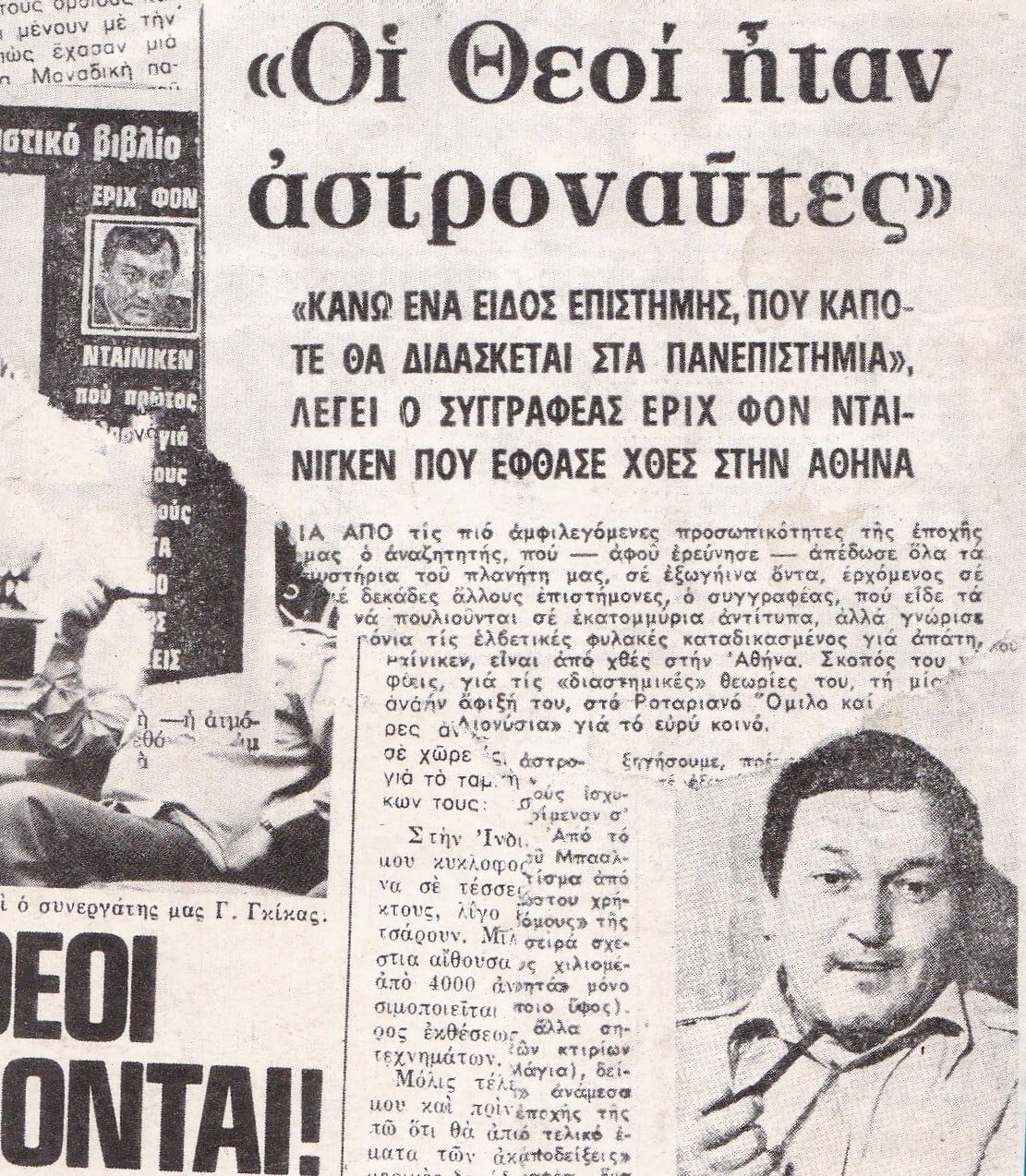 Ήδη από το τέλος των σίξτις τα περιοδικά στη χώρα μας ασχολούνται μαζί του. Έτσι, σ’ ένα μεταφρασμένο δικό του άρθρο, που θα δημοσιευόταν στο «Πρώτο» [τεύχος #469, 13 Ιουνίου 1969] ο Däniken θα ισχυριζόταν πως «οι αρχαίοι θεοί ήταν αστροναύτες», οδηγώντας το περιοδικό να γράψει στο lead «για την επαναστατική θεωρία του Ελβετού αρχαιολόγου», σημειώνοντας παράλληλα πως ό,τι θα διαβαζόταν στη συνέχεια «δεν αντιπροσωπεύει με κανέναν τρόπο τις απόψεις του εντύπου». Φύλαγε τα ρούχα σου...