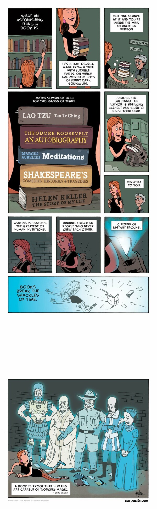«Τι εκπληκτικό πράγμα που είναι ένα βιβλίο! Είναι ένα επίπεδο αντικείμενο κατασκευασμένο από ένα δέντρο, με κάποια εύκαμπτα τμήματα στα οποία είναι αποτυπωμένες πολλές μαύρες αστείες μουντζούρες. Αλλά με μια ματιά μόνο είσαι μέσα στο μυαλό κάποιου άλλου ανθρώπου, ίσως κάποιου που είναι νεκρός εδώ και χιλιάδες χρόνια. Ένας συγγραφέας μιλάει καθαρά και αθόρυβα μέσα στο κεφάλι σου, διασχίζοντας χιλιετίες. Απευθείας σε σένα. Το γράψιμο είναι ίσως η μεγαλύτερη ανθρώπινη εφεύρεση, συνδέοντας μεταξύ τους ανθρώπους που δεν γνώριζαν ο ένας τον άλλον, πολίτες μακρινών εποχών. Το βιβλίο σπάει τα δεσμά του χρόνου. Το βιβλίο είναι η απόδειξη ότι οι άνθρωποι μπορούν να κάνουν μάγια».