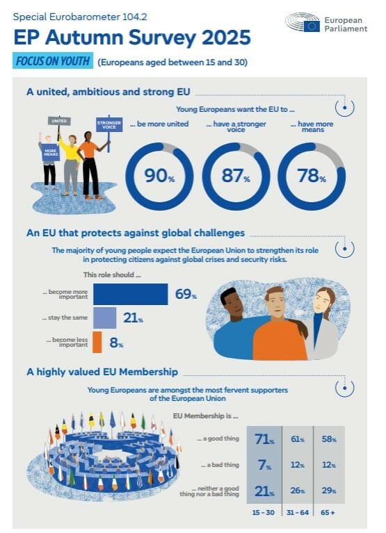 Από κοινωνικοδημογραφική άποψη, οι νέοι εξακολουθούν να είναι από τους πιο ένθερμους υποστηρικτές της ΕΕ και έχουν υψηλές προσδοκίες όσον αφορά τον ρόλο της. Οι πολίτες ηλικίας 15 έως 30 ετών είναι πιο πιθανό να έχουν θετική εικόνα τόσο για την ΕΕ (58% έναντι 49% και 43% στις μεγαλύτερες ηλικιακές ομάδες) όσο και για το Ευρωπαϊκό Κοινοβούλιο, ενώ το 68% επιθυμεί να ενισχυθεί ο ρόλος του (έναντι 58% και 54%). Μεταξύ των νεότερων Ευρωπαίων καταγράφεται επίσης πολύ ισχυρή στήριξη για μεγαλύτερη ενότητα μεταξύ των κρατών μελών στο σημερινό περιβάλλον (90%), περισσότερα μέσα για την Ευρωπαϊκή Ένωση (78%) και ισχυρότερη φωνή της ΕΕ σε διεθνές επίπεδο (87%). Τα πλήρη αποτελέσματα της έρευνας είναι διαθέσιμα στον ιστότοπο του Ευρωβαρόμετρου.