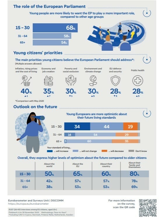Η ακρίβεια εξακολουθεί να πλήττει το βιοτικό επίπεδο των πολιτών. Όσον αφορά τις εσωτερικές πολιτικές της ΕΕ, το 41% των ερωτηθέντων αναφέρει τον πληθωρισμό, την ακρίβεια και το κόστος διαβίωσης ως την κορυφαία προτεραιότητα που επιθυμούν να αντιμετωπίσει το Ευρωπαϊκό Κοινοβούλιο, με τα ποσοστά να ανέρχονται στο 53% στην Ελλάδα και στο 34% στην Κύπρο. Ακολουθούν η οικονομία και η δημιουργία θέσεων εργασίας (35% σε επίπεδο ΕΕ, ποσοστό υψηλότερο κατά πέντε μονάδες σε σχέση με τον Μάιο του 2025), με ιδιαίτερα υψηλά ποσοστά στην Ελλάδα (60%) και την Κύπρο (43%). Στην Ελλάδα και την Κύπρο, σημαντικές προτεραιότητες αποτελούν επίσης η δημόσια υγεία (54% και 39% αντίστοιχα), η μετανάστευση και το άσυλο στην Κύπρο (39%), καθώς και η φτώχεια και ο κοινωνικός αποκλεισμός στην Ελλάδα (46%). Παρότι οι περισσότεροι ερωτηθέντες αναμένουν ότι το βιοτικό τους επίπεδο θα παραμείνει σταθερό τα επόμενα πέντε χρόνια, ένα σημαντικό ποσοστό προβλέπει επιδείνωση (28% σε επίπεδο ΕΕ, 39% στην Ελλάδα και 33% στην Κύπρο), ιδίως σε χώρες όπου επικρατεί αίσθημα οικονομικής αβεβαιότητας. Ο φόβος για μείωση του βιοτικού επιπέδου είναι μεγαλύτερος στη Γαλλία (45%), στο Βέλγιο και στη Σλοβακία (από 40%).