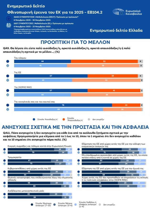 Απαισιοδοξία εκφράζει, επίσης το 39% των ερωτηθέντων για το μέλλον της Ευρωπαϊκής Ένωσης (53% στην Ελλάδα και 48% στην Κύπρο), καθώς και το 41% για το μέλλον της χώρας τους (56% και 50% αντίστοιχα). Σε ατομικό επίπεδο, ωστόσο, η εικόνα είναι πιο θετική. Πάνω από τα τρία τέταρτα των πολιτών στην ΕΕ (76%) δηλώνουν αισιόδοξοι για το προσωπικό τους μέλλον και το μέλλον της οικογένειάς τους, με τα ποσοστά να διαμορφώνονται στο 69% στην Ελλάδα και στο 75% στην Κύπρο.