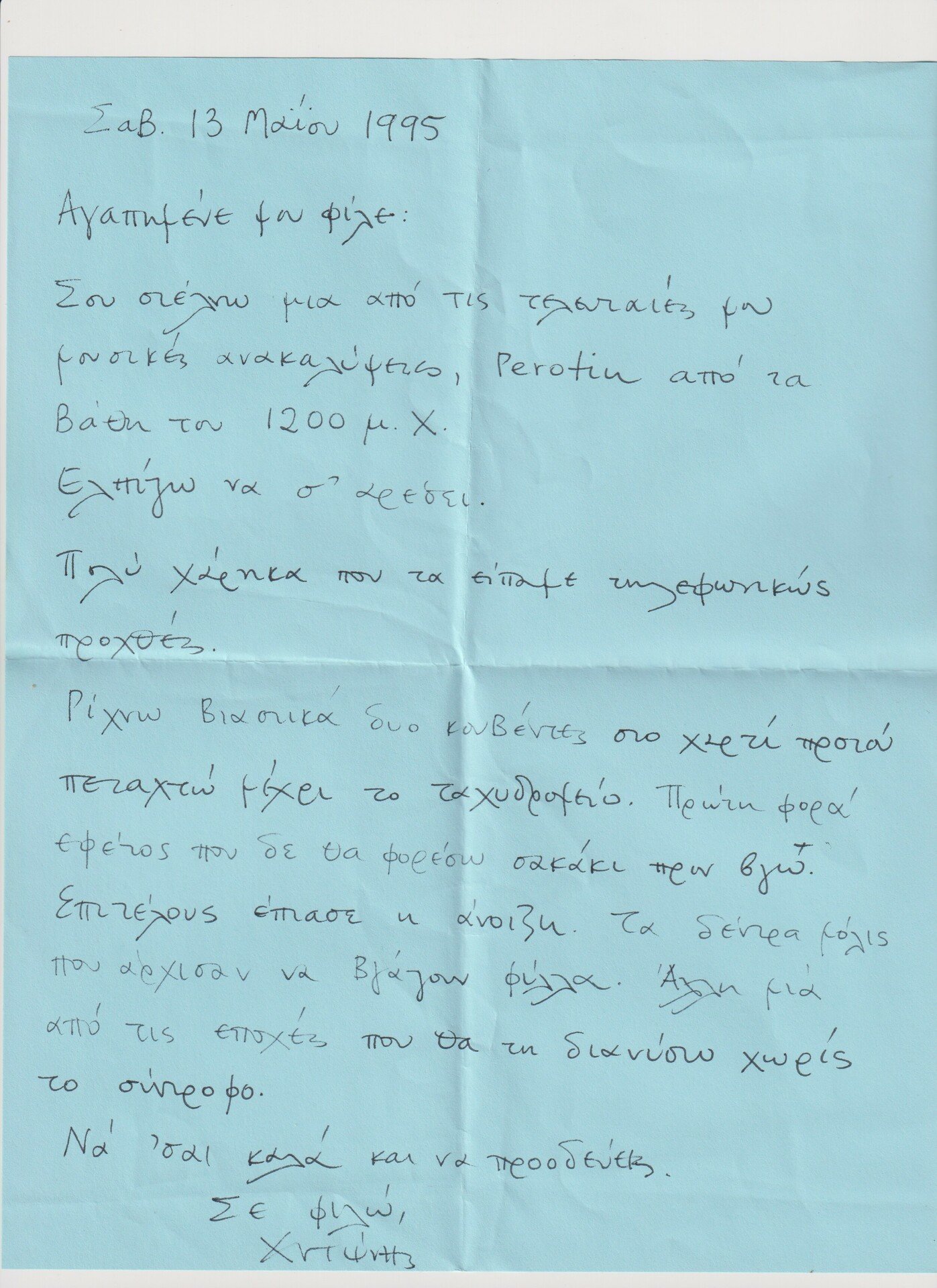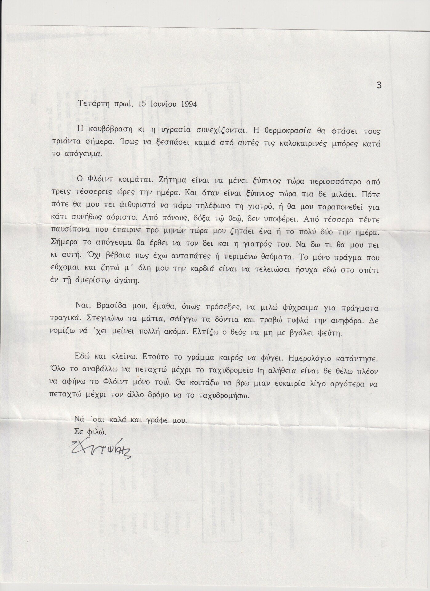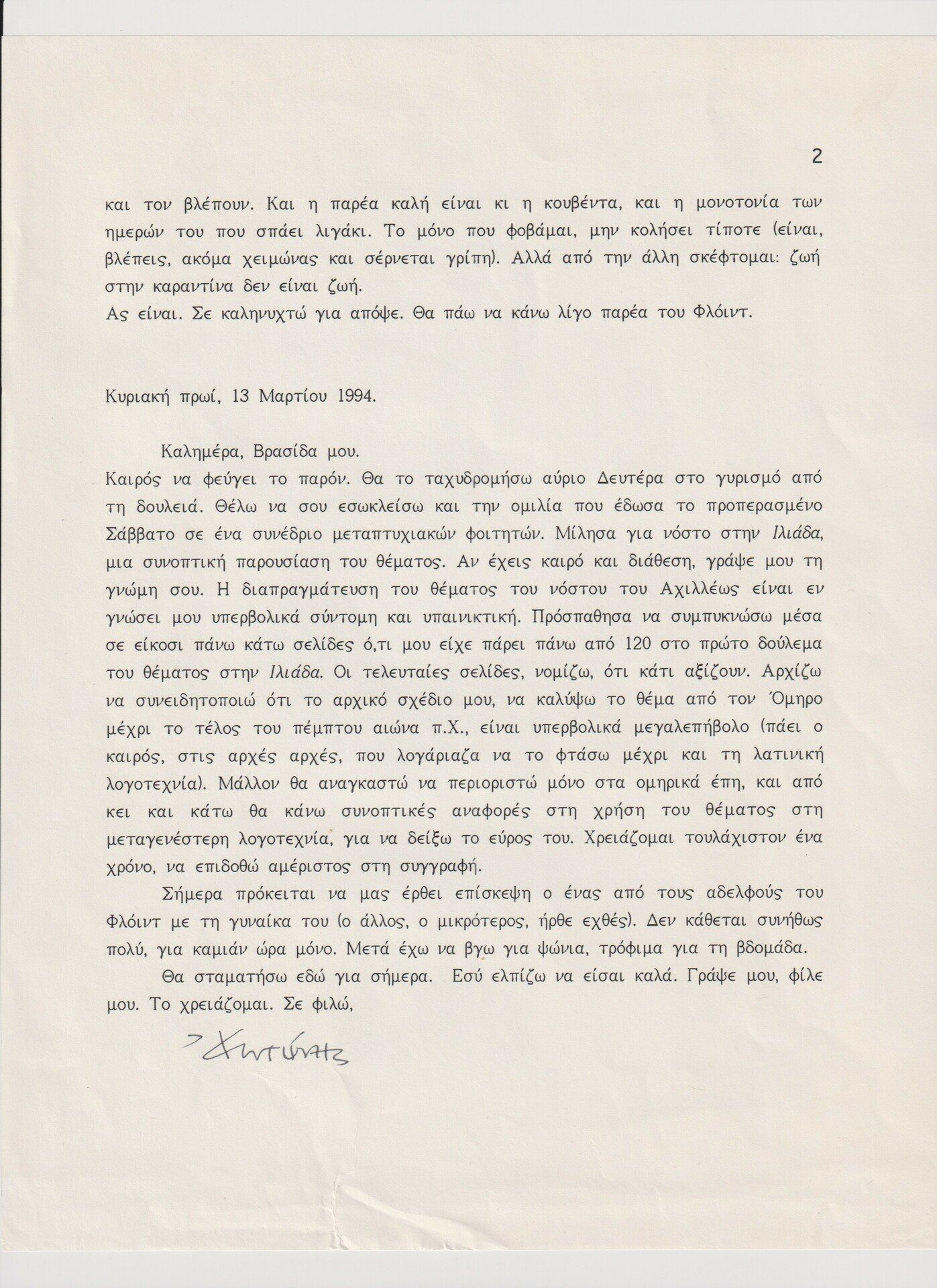 Διαβάζω ξανά και ξανά τα υπέροχα γράμματά του, ισάξια των καλύτερων επιστολών της ελληνικής γλώσσας, που ελπίζω κάποτε να δημοσιοποιήσω. Αυτά απομένουν ως τα μόνα τεκμήρια της ύπαρξής του, σκονισμένα και ξεχασμένα για χρόνια σε συρτάρια και κουτιά.