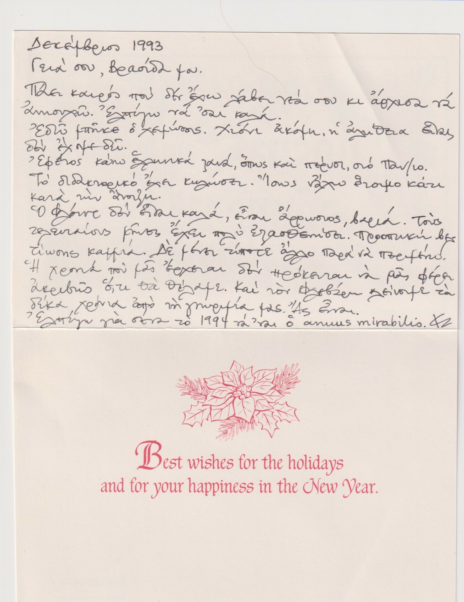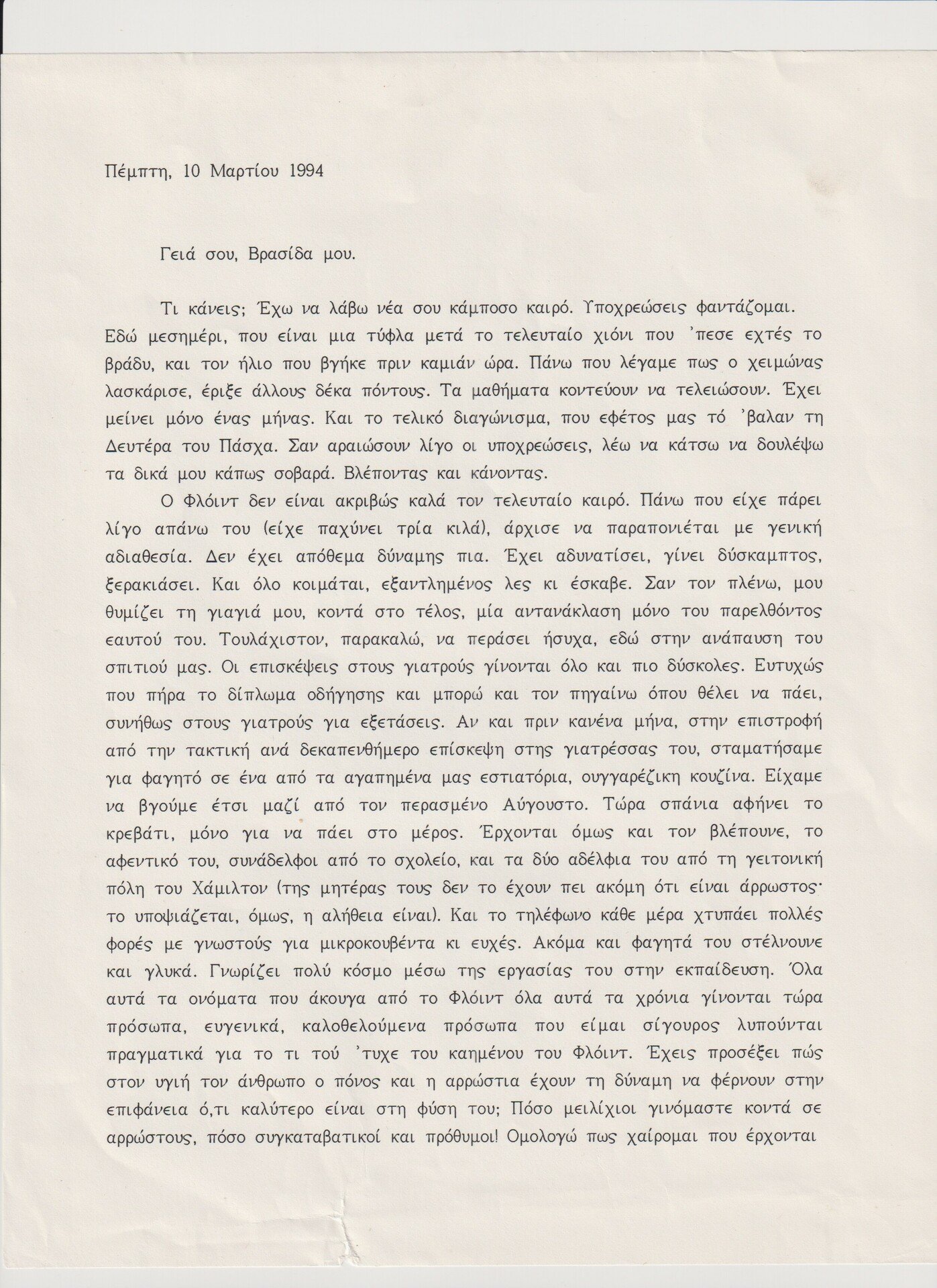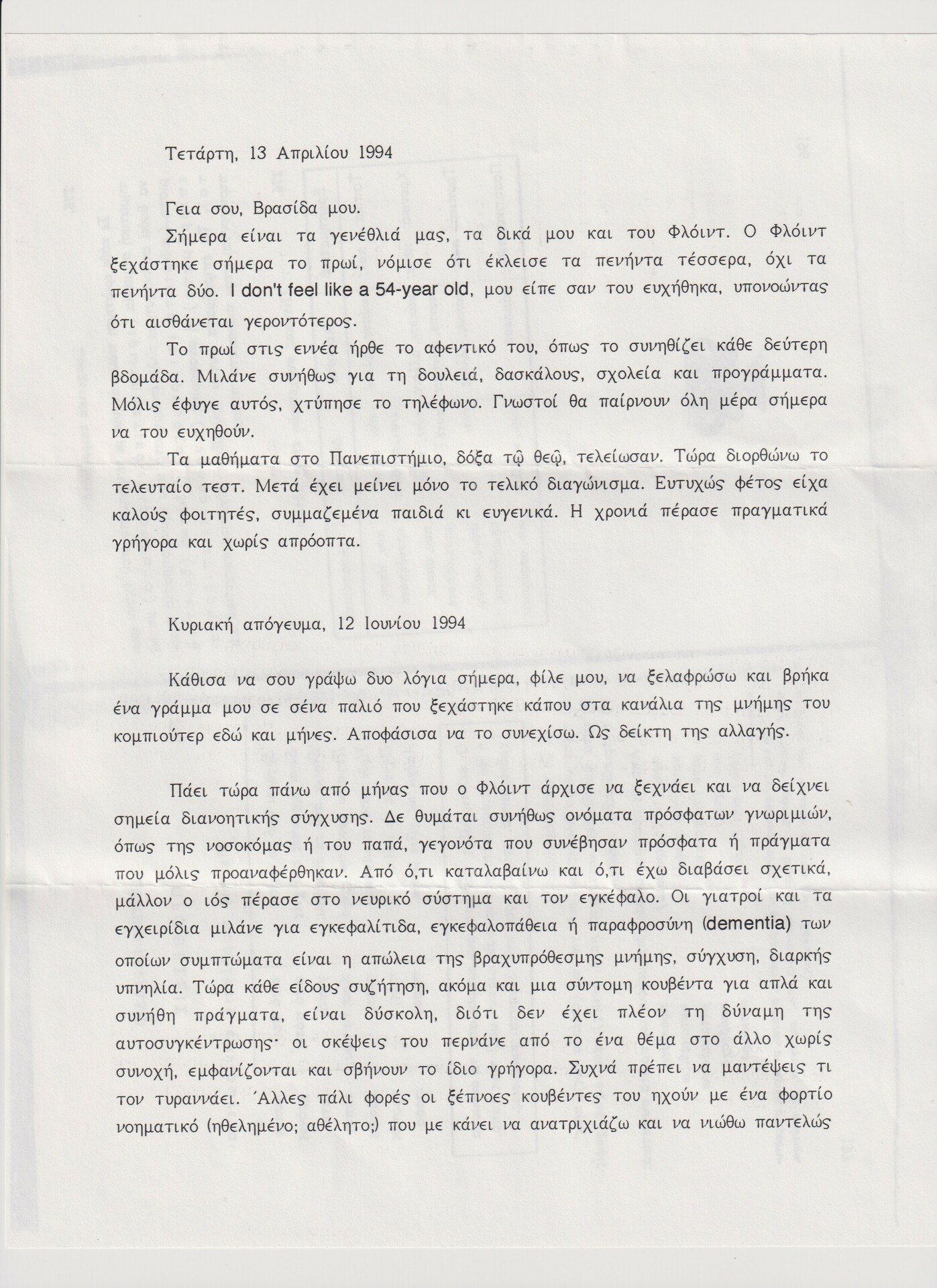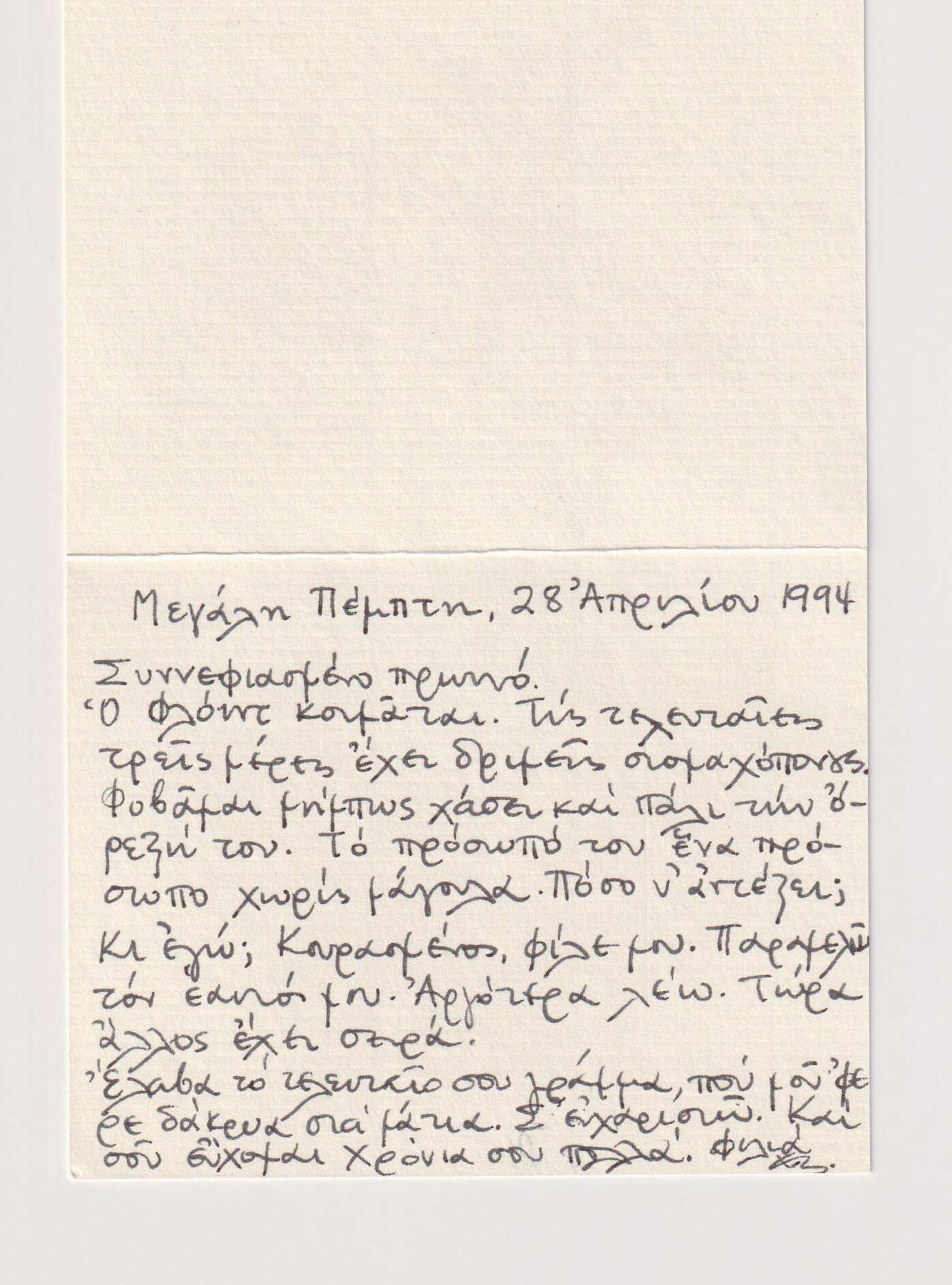 Διαβάζω ξανά και ξανά τα υπέροχα γράμματά του, ισάξια των καλύτερων επιστολών της ελληνικής γλώσσας, που ελπίζω κάποτε να δημοσιοποιήσω. Αυτά απομένουν ως τα μόνα τεκμήρια της ύπαρξής του, σκονισμένα και ξεχασμένα για χρόνια σε συρτάρια και κουτιά.