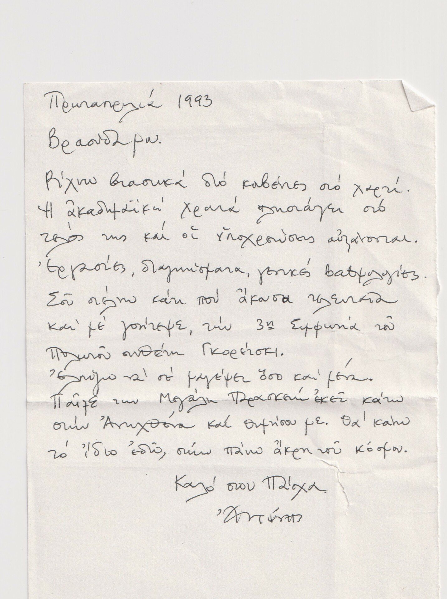 Όταν τελειώσαμε το λύκειο, ο Αντώνης πέρασε πανεπιστήμιο στα Γιάννενα. Έφυγε αμέσως και δεν ήθελε να ξαναγυρίσει. Μετά πήγε για μεταπτυχιακά στη Θεσσαλονίκη με τον καθηγητή Δημήτρη Μαρωνίτη, όπου έγινε η μοιραία συνάντηση με τον Καναδό. Έκτοτε από τη Θεσσαλονίκη άρχισε η αλληλογραφία μας που διήρκεσε περίπου δώδεκα χρόνια, μέχρι μερικές εβδομάδες προτού φύγει για την πολιτεία των σκιών.