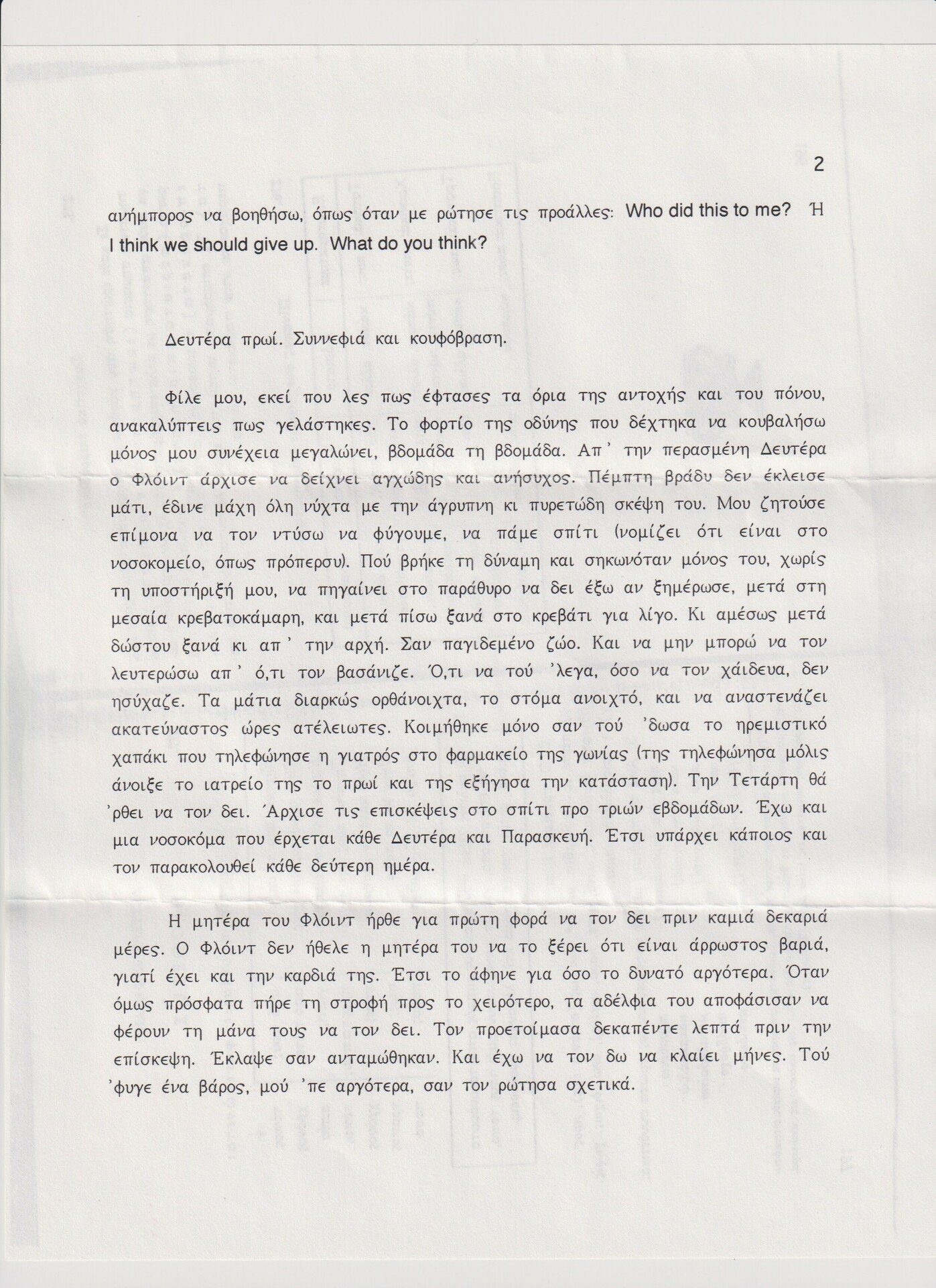Δεν δέχτηκε να πάρει φάρμακα. Προσπάθησε να ξαναρχίσει τη ζωή του, πούλησε το σπίτι που μένανε, έπιασε μια καινούργια σχέση, αλλά δεν άντεξε και παραιτήθηκε. Περίμενε τον θάνατο μόνος του στον Τορόντο. Το μόνο πράγμα που τον κρατούσε στη ζωή ήταν να παίρνει τηλέφωνο τον παλιό του φίλο που είχε κι αυτός χαθεί στην απεραντοσύνη της Αυστραλίας, και να του μιλάει για την πρόοδο της αρρώστιας. Να την περιγράφει σαν να ήταν ζωγραφικός πίνακας. Σαν να ήταν μια αποκάλυψη. Ένα δράμα λυτρωτικό. Μερικές φορές διάβαζε στίχους από το αγαπημένο του ποίημα, τον «Κρητικό» του Σολωμού. Ή από τον Καβάφη, ή τον Σεφέρη και τον Ρίτσο. Ακόμα και στίχους του Οβίδιου που είχε μεταφράσει. Ή τραγουδάγανε μαζί, Λέοναρντ Κοέν, «Dance me to the end of love». Και μόνος περίμενε τον Χάρο να τον πάρει. Και δεν φοβόταν. Δεν έκλαιγε. Δεν παραπονιόταν. «Ήταν φυσικό όλα να έλθουν όπως ήλθαν», έλεγε. «Και να τελειώσουν όπως θα τελειώσουν. Δεν έπρεπε να γεννηθώ. Δεν έπρεπε να έχω δει το φως της ημέρας. Δεν μου δόθηκε τίποτα. Από την πρώτη μέρα που άνοιξα τα μάτια μου με έτρωγε το σαράκι της ανυπαρξίας που με περίμενε τόσο νωρίς. Η κατάρα της γέννησής μου. Η τιμωρία τού να δω το φως της ημέρας».