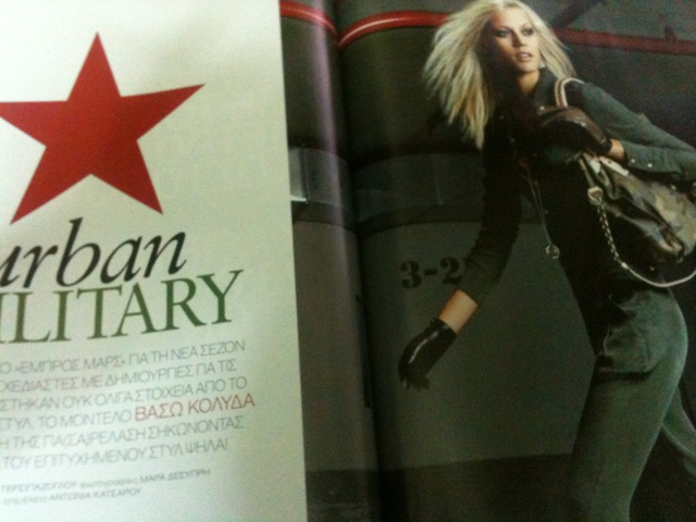 Urban Military για το μοντέλο Βάσω Κολλυδά (;) που όπως λέει «η τηλεόραση προέκυψε στη ζωή μου εντελώς ξαφνικά». Και έτσι ξαφνικά επίσης, έπαψε να... προκύπτει.  (InStyle – Νοέμβριος 2010)