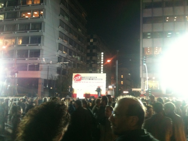 Στην πραγματικότητα δεν είχε πολύ κόσμο, αλλα οσοι ήταν εκεί ηταν πολυ ενθουσιώδεις μιας και περίμεναν όλο αγωνία να ακουσουν την Αλέκα Παπαρηγα που βγήκε και δήλωσε οτι ο λαός θα δώσει την απάντηση στην τρόικα. Ακούγαμε τις φωνές για αρκετή ώρα στο γραφείο εγώ κάτι είπα και πεταχτηκε το ακέφαλο τέρας του ατελιέ και μου είπε οτι οταν θα παιρνω σύνταξη 400 ευρω μόνο το ΚΚΕ θα διαμαρτύρεται. Άρχισα να του λέω διάφορα γλωσσοκοπανίστικα και μετα σκέφτηκα οτι μπορει να χει και δίκιο.