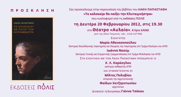 Την Δευτέρα, 20 Φεβρουαρίου, στο Θέατρο "Αυλαία" θα γίνει η παρουσίαση του βιβλίου του Λάκη Παπαστάθη "Το καλοκαίρι θα παίξει την Κλυταιμνήστρα". Θα υπάρχουν εισηγήσεις από την Μαρία Αθανασοπούλου και την Ιωάννα Ναούμ. Στη συζήτηση με τον συγγραφέα, προεδρεύει ο Χ.Λ. Καράογλου και συμμετέχουν οι Μίλτος Πολυβίου και Φαίδων Χατζηαντωνίου. Διαβάζει η θεατρολόγος Γιάννα Τσόκου.