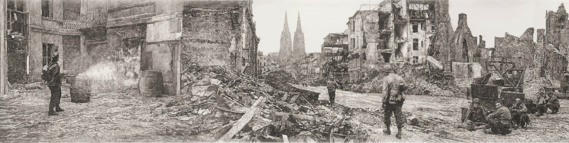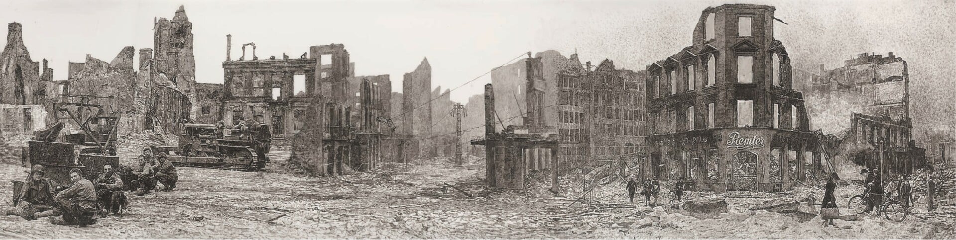 Τελευταίο μέρος αυτής της ζωφόρου είναι η σύνθεση Among the Dead Cities, όπου εικόνα από το Γκέτο της Βαρσοβίας συνυπάρχει με εκείνες τις εικόνες από τα ερείπια των βομβαρδισμένων πόλεων του Αμβούργου, του Μοντμπούρ, της Κολωνίας και της Γκερνίκα την περίοδο 1937-1945. Δίπλα στα ερείπια παρουσιάζεται μια σειρά συνθέσεων μεγάλων διαστάσεων με θέμα μεταλλικά δοχεία που περιέχουν τον θάνατο. Και μαζί τους, σε μια απρόσμενη-ειρωνική συνύπαρξη, ένα τσαλακωμένο κουτάκι Coca-Cola και μια κονσέρβα της UNRRA ως σύμβολα της αμερικάνικης κυριαρχίας.