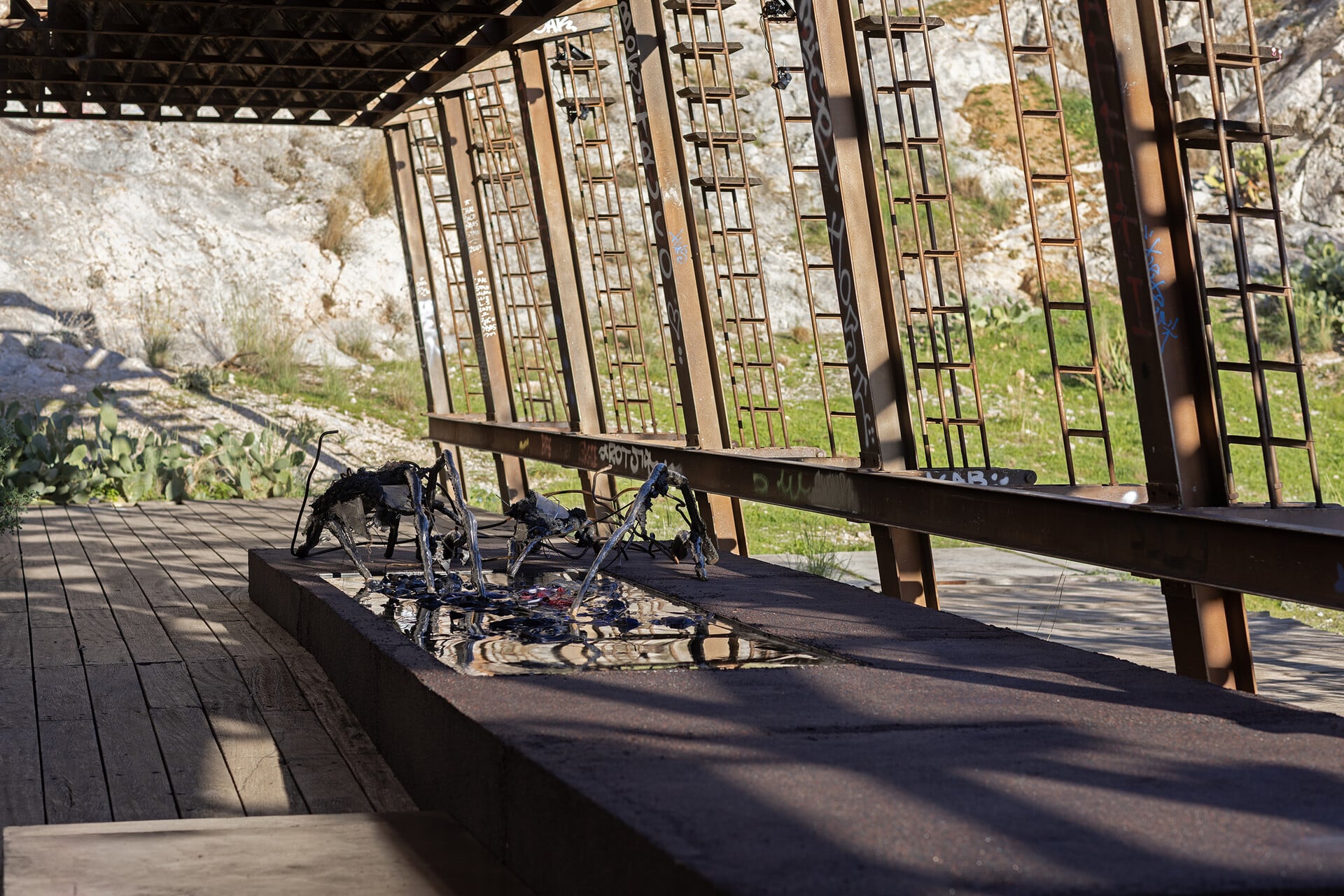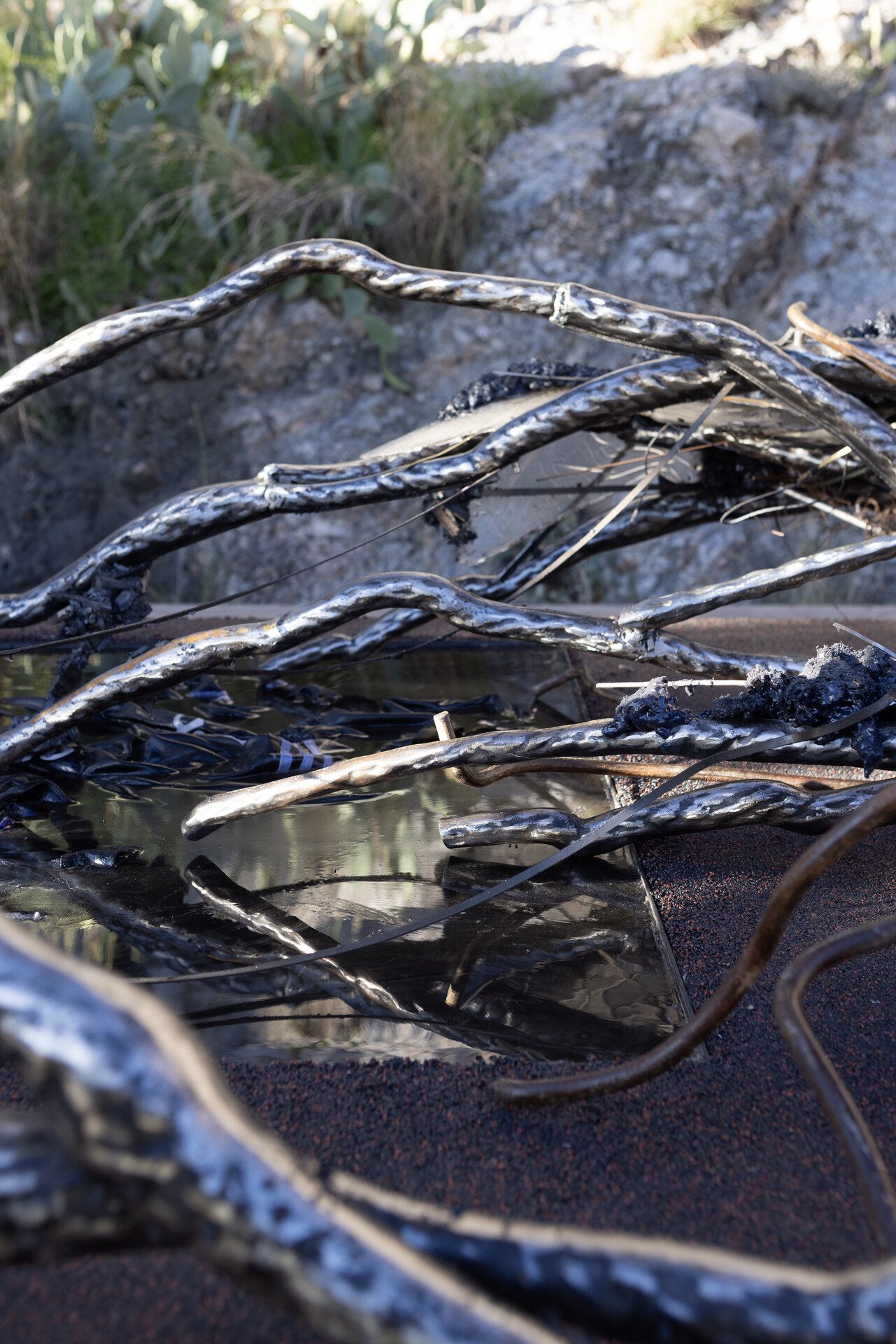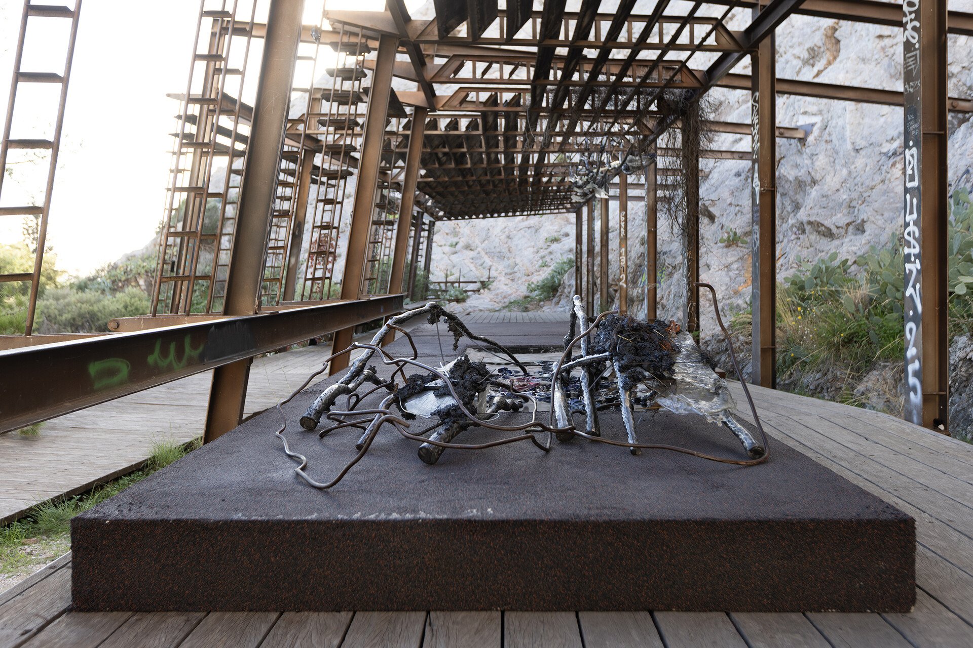 Στο γλυπτό αποτυπώνονται μέρη από τα κλαδιά του φυτού που βρίσκεται διάσπαρτο στο λόφο, ‘μεταφρασμένα’ σε σίδερο, μέσα από τον σχεδιασμό τρισδιάστατων μοντέλων και από διαδικασίες βιομηχανικής παραγωγής. Το φυτό αυτό, η μηδική, μοιάζει ξερό ενώ δεν είναι, πέφτει σε φθινοπωρινό λήθαργο και όταν επιστρέψουν οι ευνοϊκές συνθήκες αναπτύσσεται πάλι. Υπενθυμίζει τον κύκλο ζωής περνώντας μέσα από τον θάνατο.