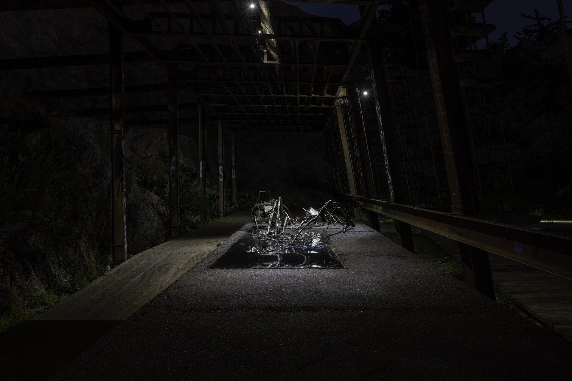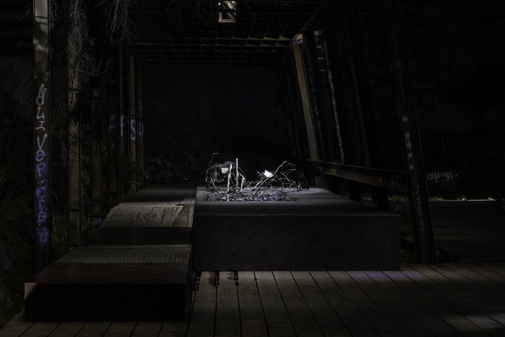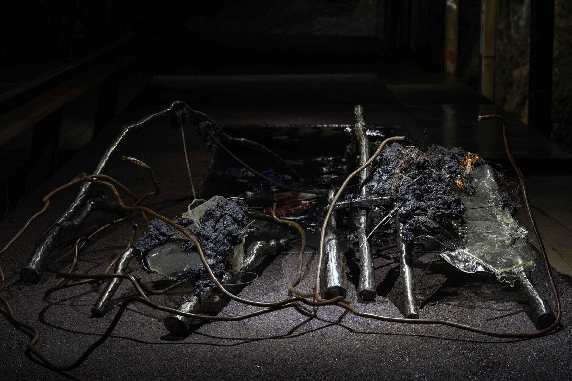Στο γλυπτό αποτυπώνονται μέρη από τα κλαδιά του φυτού που βρίσκεται διάσπαρτο στο λόφο, ‘μεταφρασμένα’ σε σίδερο, μέσα από τον σχεδιασμό τρισδιάστατων μοντέλων και από διαδικασίες βιομηχανικής παραγωγής. Το φυτό αυτό, η μηδική, μοιάζει ξερό ενώ δεν είναι, πέφτει σε φθινοπωρινό λήθαργο και όταν επιστρέψουν οι ευνοϊκές συνθήκες αναπτύσσεται πάλι. Υπενθυμίζει τον κύκλο ζωής περνώντας μέσα από τον θάνατο.