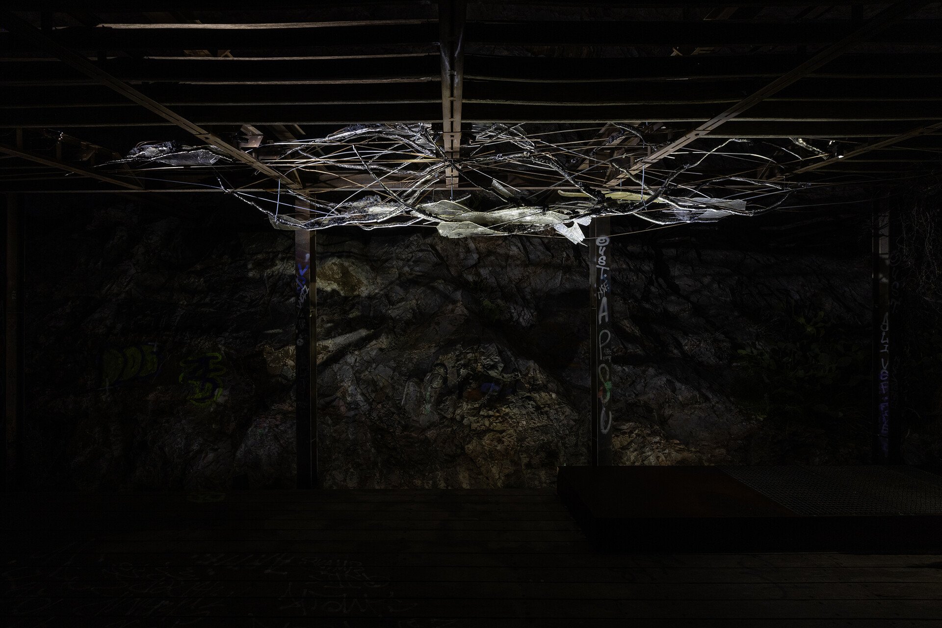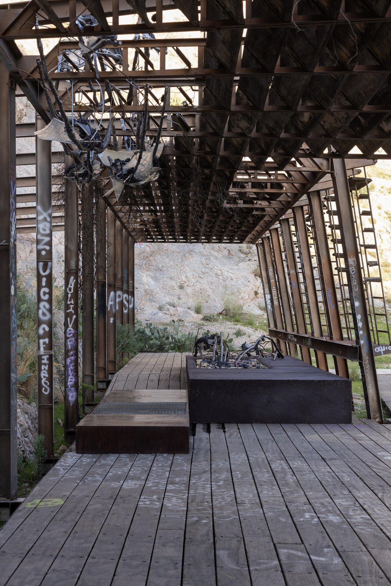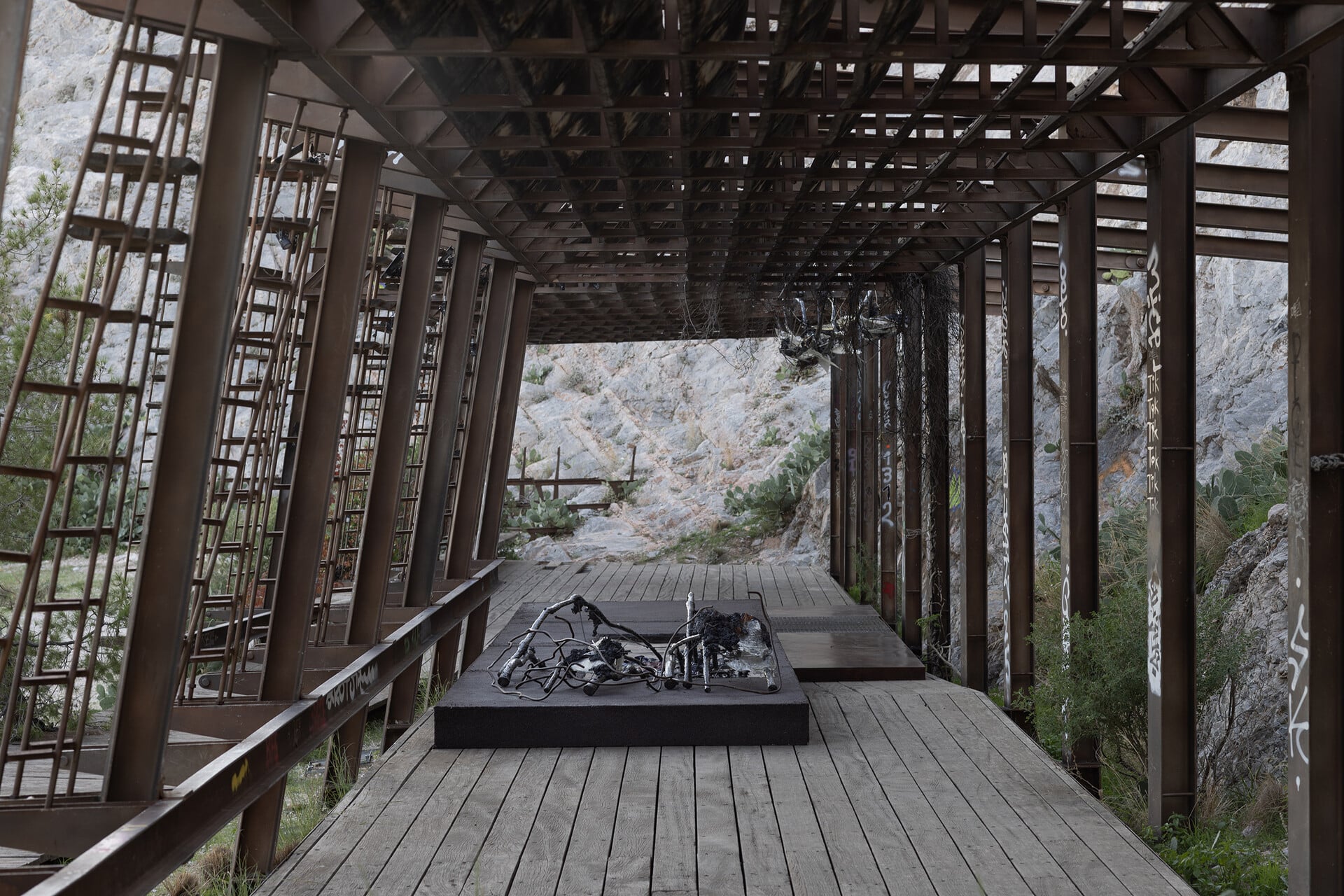 Ο Αλέξανδρος Τζάννης δημιουργεί ένα γλυπτό-παράσιτο που περικυκλώνει τη διάτρητη κατασκευή που έχει μείνει σαν σκελετός, και την κατοικεί. Εισάγει μια αυστηρή γεωμετρία, σχηματίζει ένα άκαμπτο πλαίσιο που λειτουργεί ως όριο και περιχαρακώνει το χώρο.