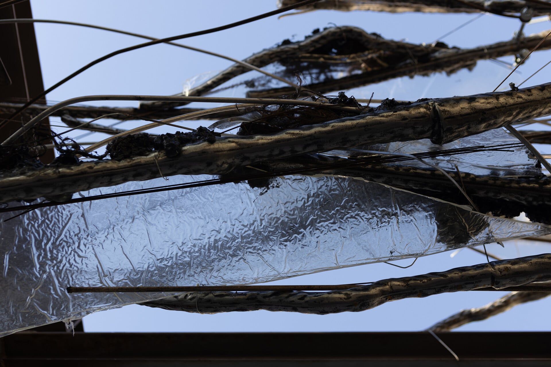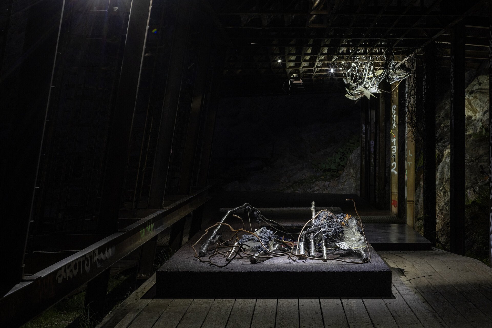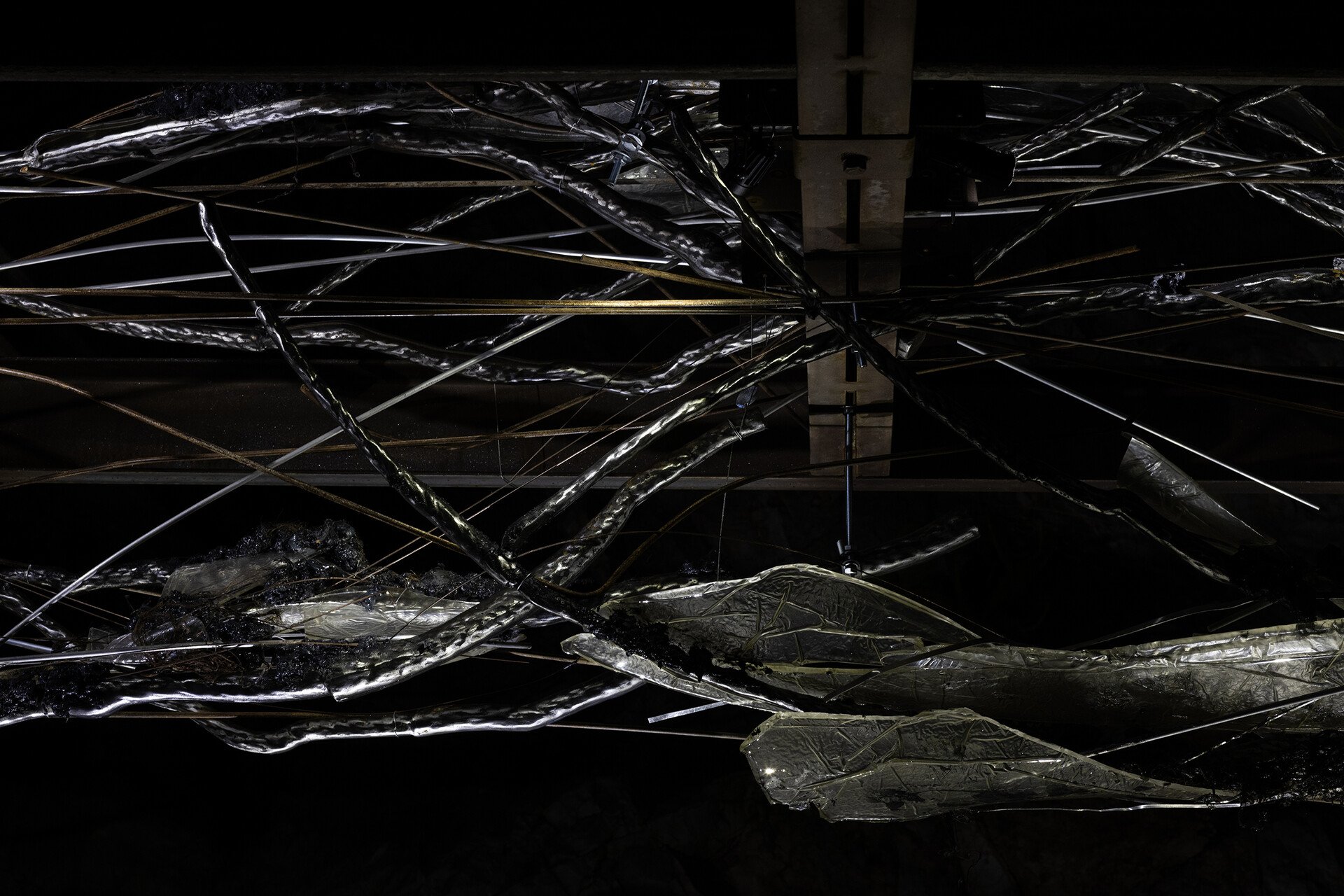 Ο Αλέξανδρος Τζάννης δημιουργεί ένα γλυπτό-παράσιτο που περικυκλώνει τη διάτρητη κατασκευή που έχει μείνει σαν σκελετός, και την κατοικεί. Εισάγει μια αυστηρή γεωμετρία, σχηματίζει ένα άκαμπτο πλαίσιο που λειτουργεί ως όριο και περιχαρακώνει το χώρο.