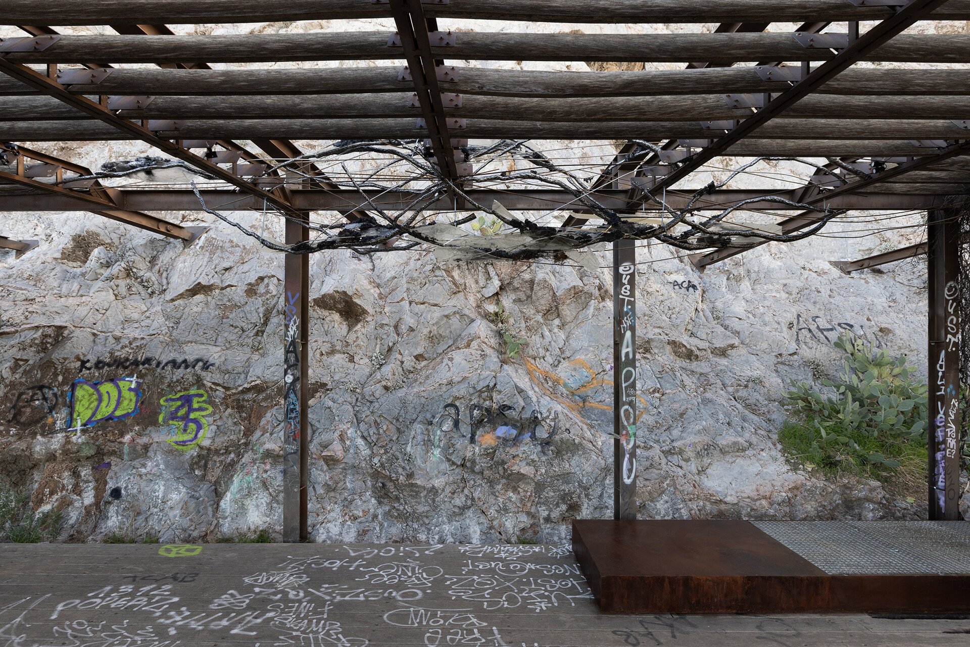 Η έκθεση του Αλέξανδρου Τζάννη Athens Dies In Dreams At Sunrise πραγματοποιείται στο παλιό λατομείο, στη νότια πλευρά του λόφου Φιλοπάππου. Στο σημείο αυτό, οι αρχιτέκτονες Μπούκη Μπαμπάλου-Νουκάκη και Αντώνης Νουκάκης δημιούργησαν μια ανοιχτή κατασκευή – υποδομή για υπαίθρια έκθεση γλυπτικής, στο πλαίσιο του προγράμματος ενοποίησης των αρχαιολογικών χώρων το 2003. Η κατασκευή αυτή, αν και δεν χρησιμοποιήθηκε ποτέ για τον αρχικό της σκοπό, παραμένει αγκιστρωμένη στον βράχο ως σιωπηλό αποτύπωμα της πρόθεσης εκείνης. Πάνω σε αυτήν προσαρτάται το γλυπτό του Αλέξανδρου Τζάννη, επαναφέροντας την αρχική πρόθεση.