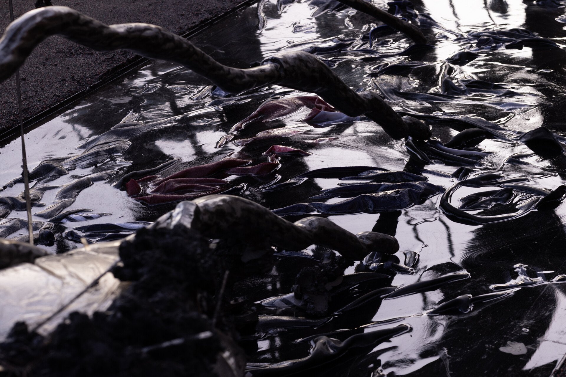 Στη βάση του γλυπτού διακρίνονται βυθισμένες αθλητικές μπλούζες, μια ενδυματολογική αναφορά στη rave κουλτούρα και στα πάρτι της δεκαετίας του ’90. Κάποια έγιναν στο λόφο του Φιλοπάππου. Τα ρούχα, πετρωμένα σ’ ένα πλαίσιο που μοιάζει ρευστό αλλά έχει στερεοποιηθεί, απηχούν αυτή την κουλτούρα.