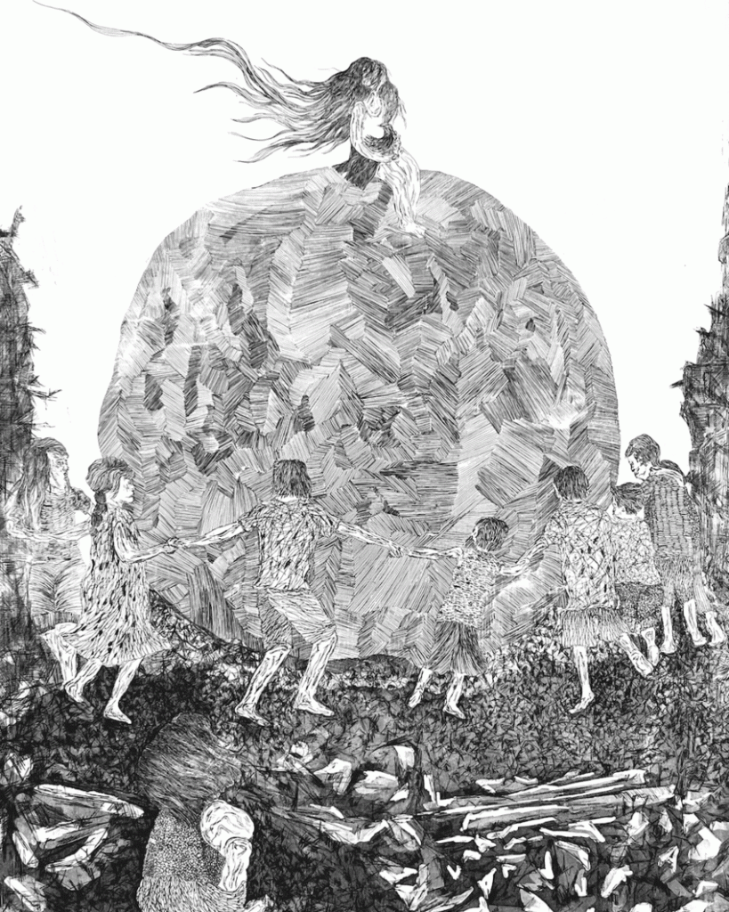Η νέα δουλειά της εικαστικού τροφοδοτείται από τη σύγχρονη συνθήκη και το υλικό της καθημερινότητας, μεταφέροντας σε εικόνες τους κραδασμούς που βιώνει ο σημερινός άνθρωπος, σε κοινωνικό και ψυχολογικό επίπεδο. Οι βιωμένες αντιφάσεις της σύγχρονης πραγματικότητας και η κοινωνική εγρήγορση εκφράζονται διαμέσου των σκληρών αντιθέσεων άσπρου και μαύρου, της νευρώδους γραμμής και του σχεδίου, που γίνεται φορέας αισθημάτων και σκέψεων, αποκαλύπτοντας την κοσμοαντίληψη της καλλιτέχνιδας. Κορμιά που δεσπόζουν σαν υψωμένες γροθιές, κυρτωμένα σώματα και πρόσωπα που φέρουν παραδοσιακές καλύπτρες, καθώς και η σημειολογία ενός πουλιού, ενός μπαλονιού, ή τα παιδικά σφιχτοπλεγμένα δάχτυλα, μεταφέρουν ηχηρά την πρόθεση της δημιουργού για κοινωνική και πνευματική αφύπνιση που γίνεται επιτακτική ανάγκη και αίτημα ζωτικής σημασίας. Τα έργα της αρθρώνονται ως μορφές αντίδρασης, ακροβατώντας ανάμεσα στην απόγνωση και την ελπίδα, που μοιραία έχουν συναισθηματικό αντίκτυπο στον σύγχρονο άνθρωπο.