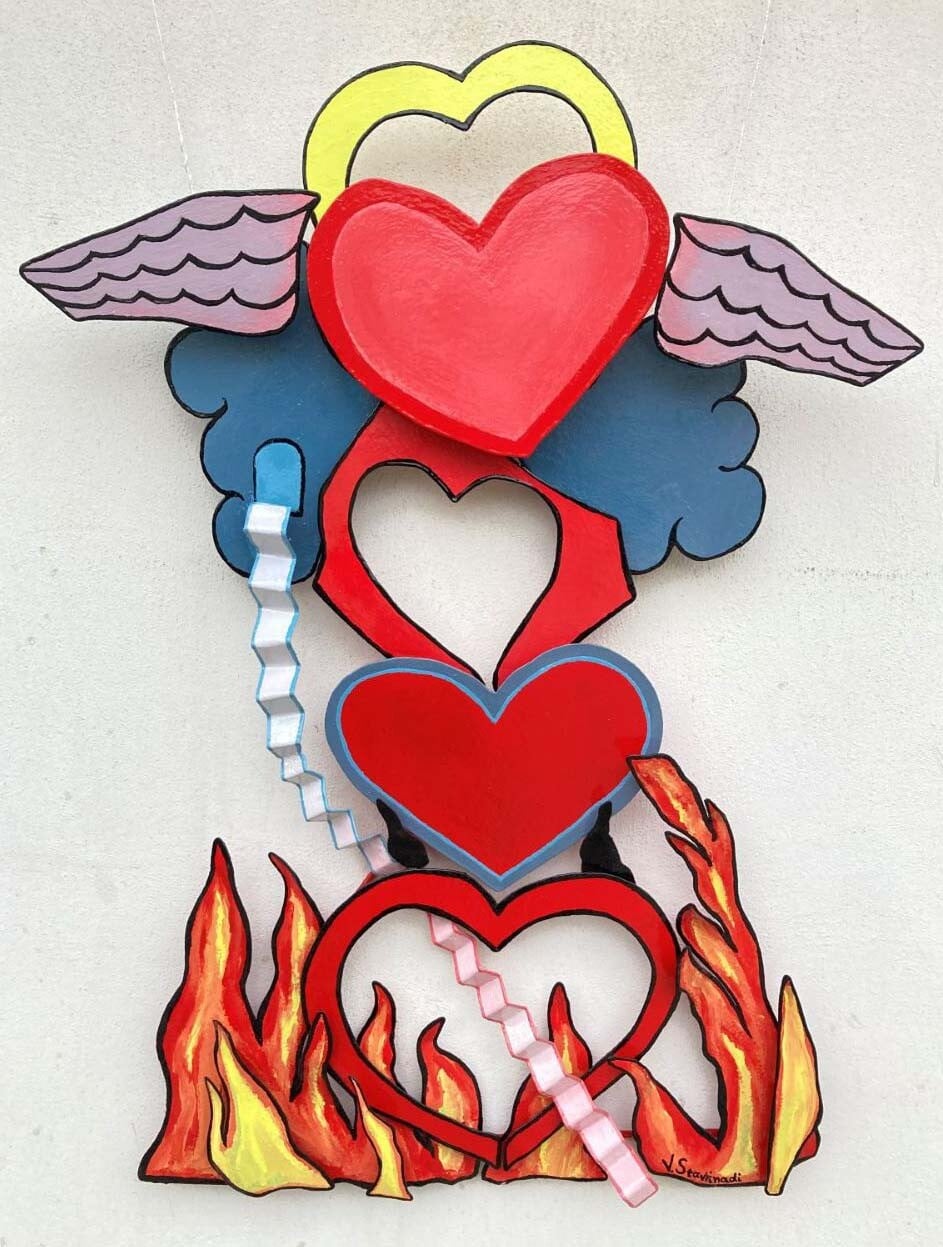 Οι γλυπτικές φόρμες γεννιούνται από δισδιάστατα μεταλλικά επίπεδα που μέσα από τη διαδικασία της κατασκευής και της συναρμολόγησης, αναπτύσσονται στο χώρο αποκτώντας τρισδιάστατη υπόσταση. Η πρακτική αυτή συνδέεται με την παράδοση της κατασκευαστικής γλυπτικής (constructed sculpture), όπου το έργο δεν προκύπτει από τη σμίλευση ενός συμπαγούς όγκου αλλά από την σύνθεση, την ένωση και την ισορροπία επιμέρους στοιχείων. Παράλληλα, η έντονη παλέτα χρωμάτων και η παιχνιδιάρικη οπτική γλώσσα που χρησιμοποιείται, δημιουργεί ένα διάλογο με το πνεύμα της Pop Art, όπου τα καθαρά ζωντανά χρώματα και οι λεπτομερείς ζωγραφικές παρεμβάσεις μετατρέπουν τις μεταλλικές επιφάνειες σε φορείς οπτικής ενέργειας. Οι συνθέσεις αναπτύσσονται αφηγηματικά και συμβολικά, δημιουργώντας μικρές εικαστικές σκηνές.