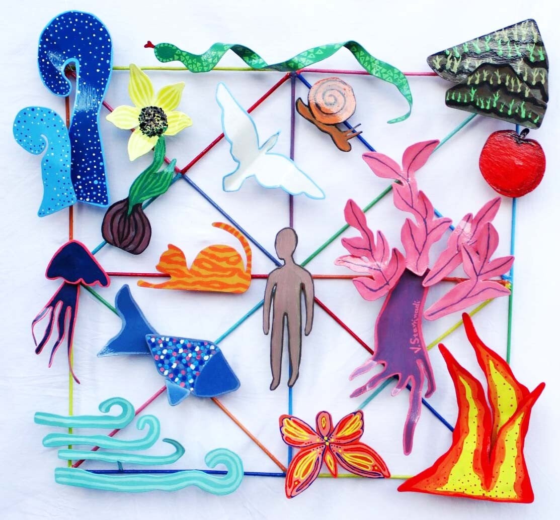 Τα έργα, σαν αναδυόμενες πολύχρωμες συχνότητες, ξεπηδούν στον χώρο διηγούμενα το καθένα μέσα από τα μοτίβα ή τις μορφές που τα απαρτίζουν, τη δική του ιστορία. Μαζί συνθέτουν έναν ρυθμικό διάλογο, όπως ακριβώς λειτουργεί και η ζωή σε ατομικό και συλλογικό επίπεδο.