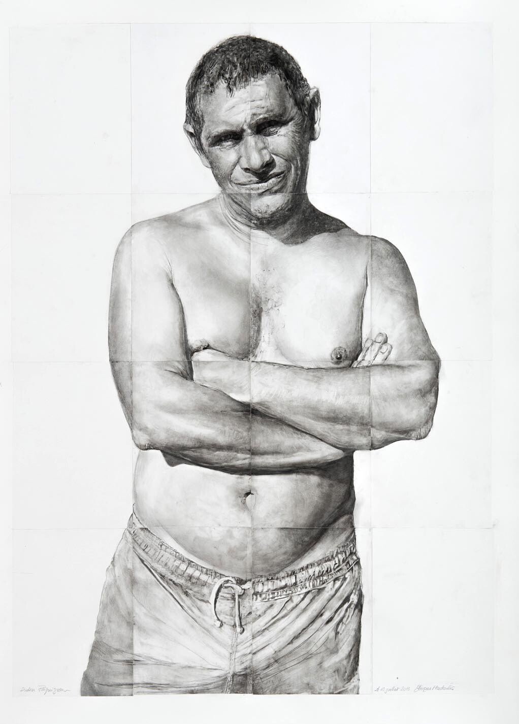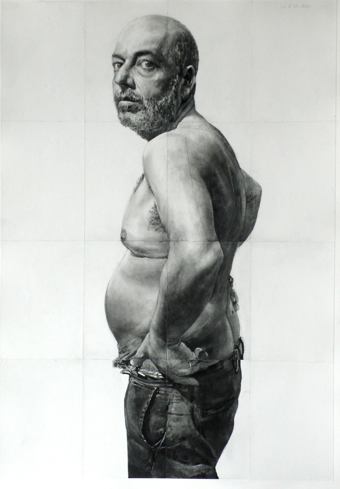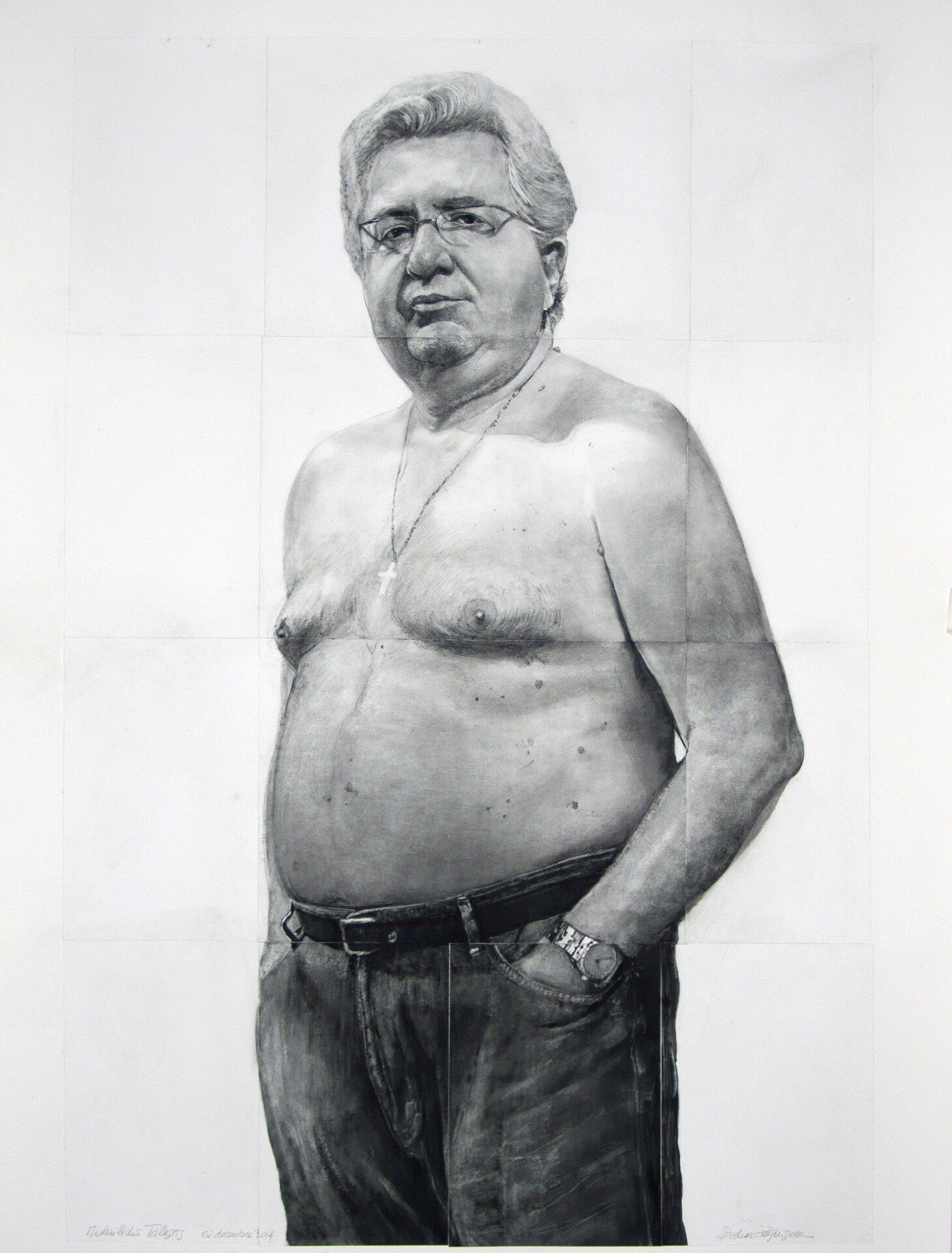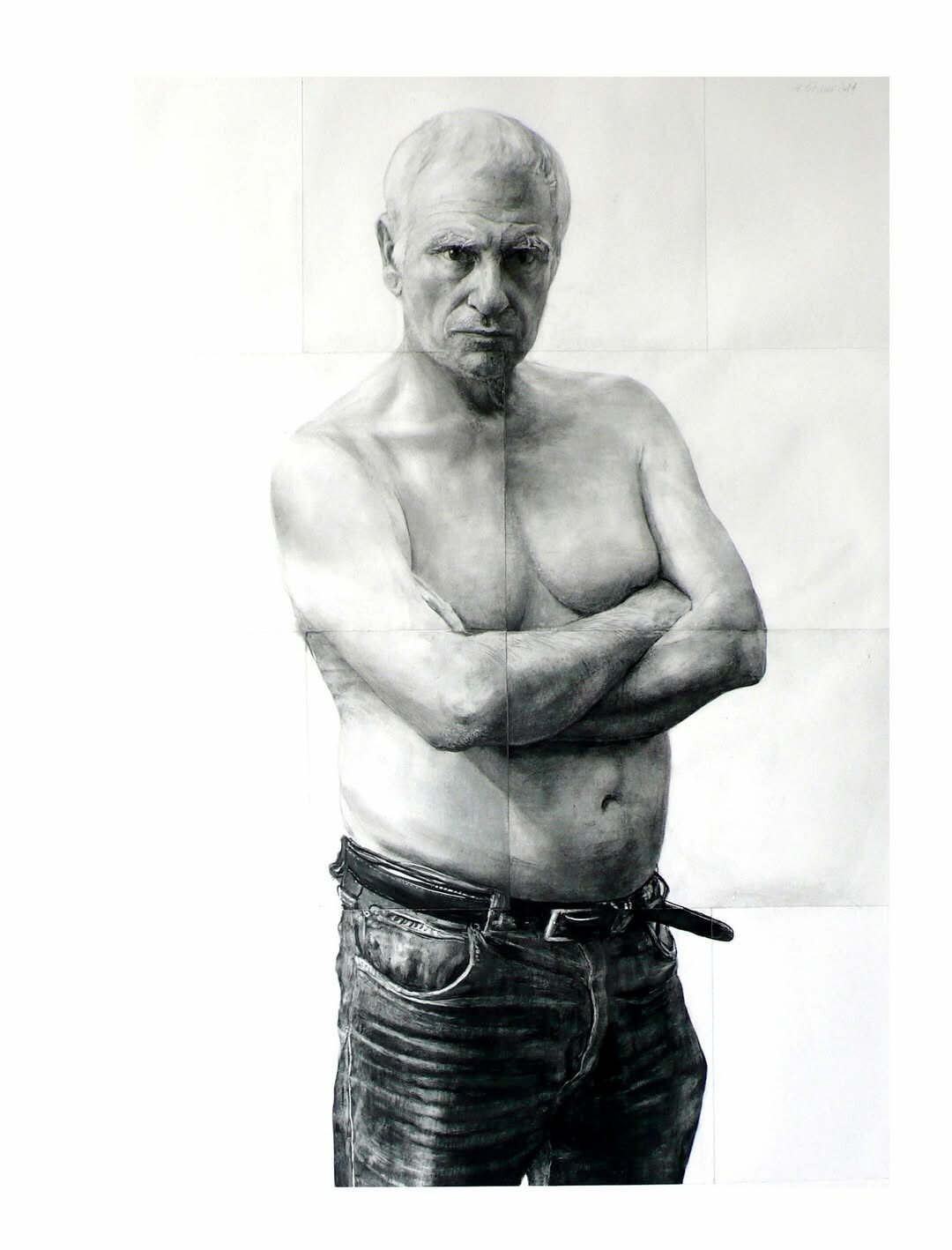 Μετά σε αλεπάλληλες διαστρωματώσεις από κάρβουνο και μαλακά μολύβια ως τις πιο λεπτές ασημένιες αποχρώσεις του γραφίτη ο ζωγράφος ενεργοποιεί όλη την υποδόρια αύρα σ’ αυτές τις μορφές. Τους απελευθερώνει δηλαδή έναν ιχνογραφημένο βιορυθμό που προκαλεί δέος στην παρατήρησή τους διατρέχοντας αυτή την ζωφόρο με τον παράδοξο και σκαμπρόζικο τίτλο «ΟΙ ΜΟΥΣΕΣ». Είναι μια ανατρεπτική θέση αμφισβήτησης και υπονόμευσης του καθιερωμένου αποδεκτού προτύπου του γυμνού ποθούμενου σώματος της γυναίκας «μούσας» του έρωτα και της τέχνης.