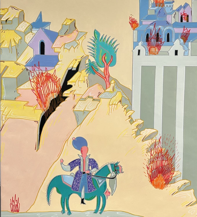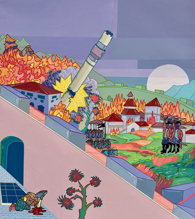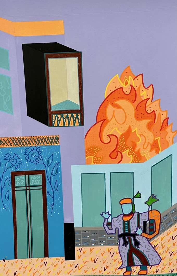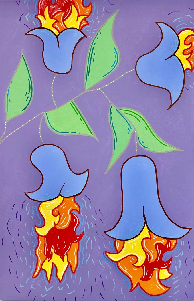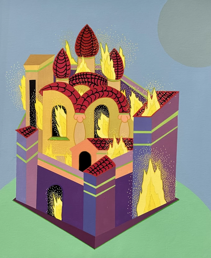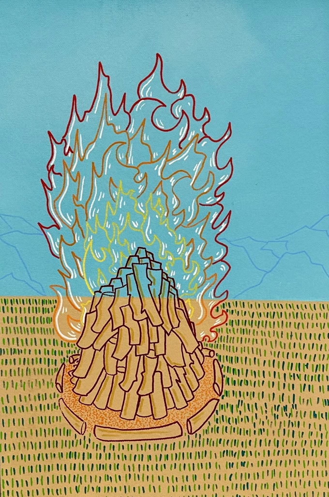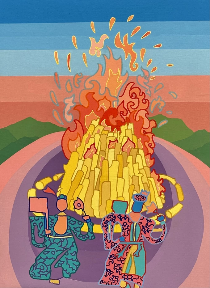 Συνυφαίνοντας βαθιά ριζωμένα τελετουργικά στοιχεία με ετερόκλητες οπτικές αναφορές και έντονες χρωματικές δομές, ο Γερούκαλης συγκροτεί ένα πεδίο όπου οι παλιές κοινοτικές ανησυχίες για παραγωγικότητα, επιβίωση και εποχική ανανέωση συναντούν τους επιταχυνόμενους οπτικούς ρυθμούς του εικοστού πρώτου αιώνα. Σε όλη την έκθεση, η φωτιά αναδύεται ως επαναλαμβανόμενο σύμβολο μεταμόρφωσης, προστασίας και συλλογικής συνάθροισης, επαναπροσδιορισμένο μέσα από μια σύγχρονη ζωγραφική γλώσσα που γεφυρώνει τη λαϊκή παράδοση με τη θραυσματική εικόνα του παρόντος.