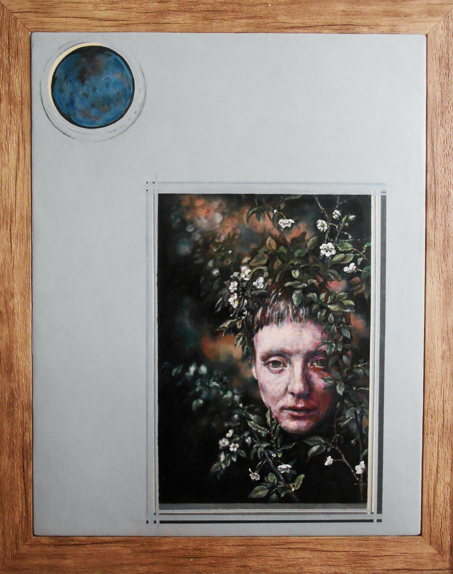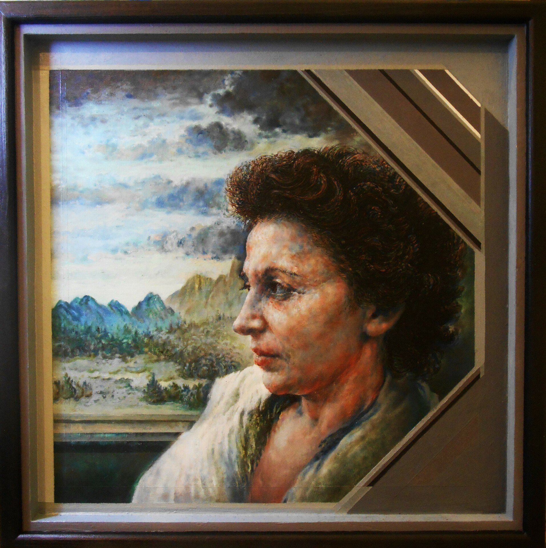 Η καλλιτέχνις επιδιώκει να αναδείξει την αντίθεση ανάμεσα στη ρεαλιστικά αποδομένη ανθρώπινη μορφή των προσωπογραφιών της και στα στυλιζαρισμένα φυτικά μοτίβα ή στα οργανωμένα χρωματικά πεδία των γεωμετρικών σχημάτων και των υπαινικτικών τοπίων που συγκροτούν τον περιβάλλοντα χώρο.