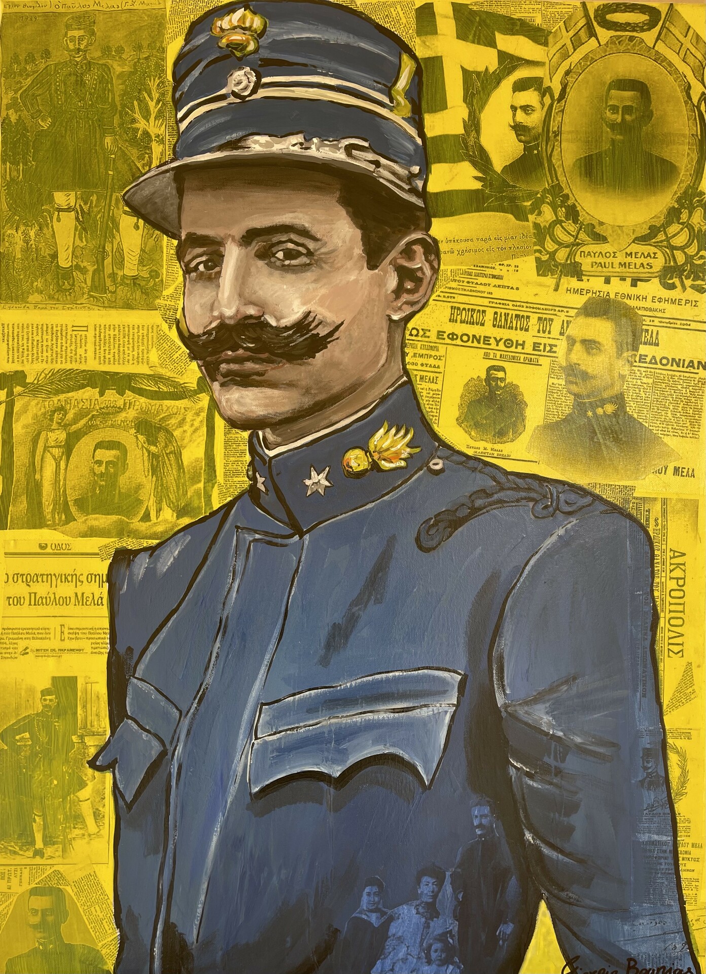 Μέσα από τη σύνθεση κολάζ, ζωγραφικής, αρχειακού υλικού και τυπογραφικών στοιχείων, ο καλλιτέχνης δημιουργεί σύγχρονα πορτρέτα που κινούνται ανάμεσα στη μνήμη, την ταυτότητα και τη συλλογική συνείδηση. Εμβληματικές προσωπικότητες όπως ο Παύλος Μελάς, η Μαρία Κάλλας και η Frida Kahlo αναδύονται από πολυεπίπεδες επιφάνειες εφημερίδων, εικόνων και χρωματικών χειρονομιών, μετατρεπόμενες σε διαχρονικά σύμβολα πολιτιστικής παρουσίας.