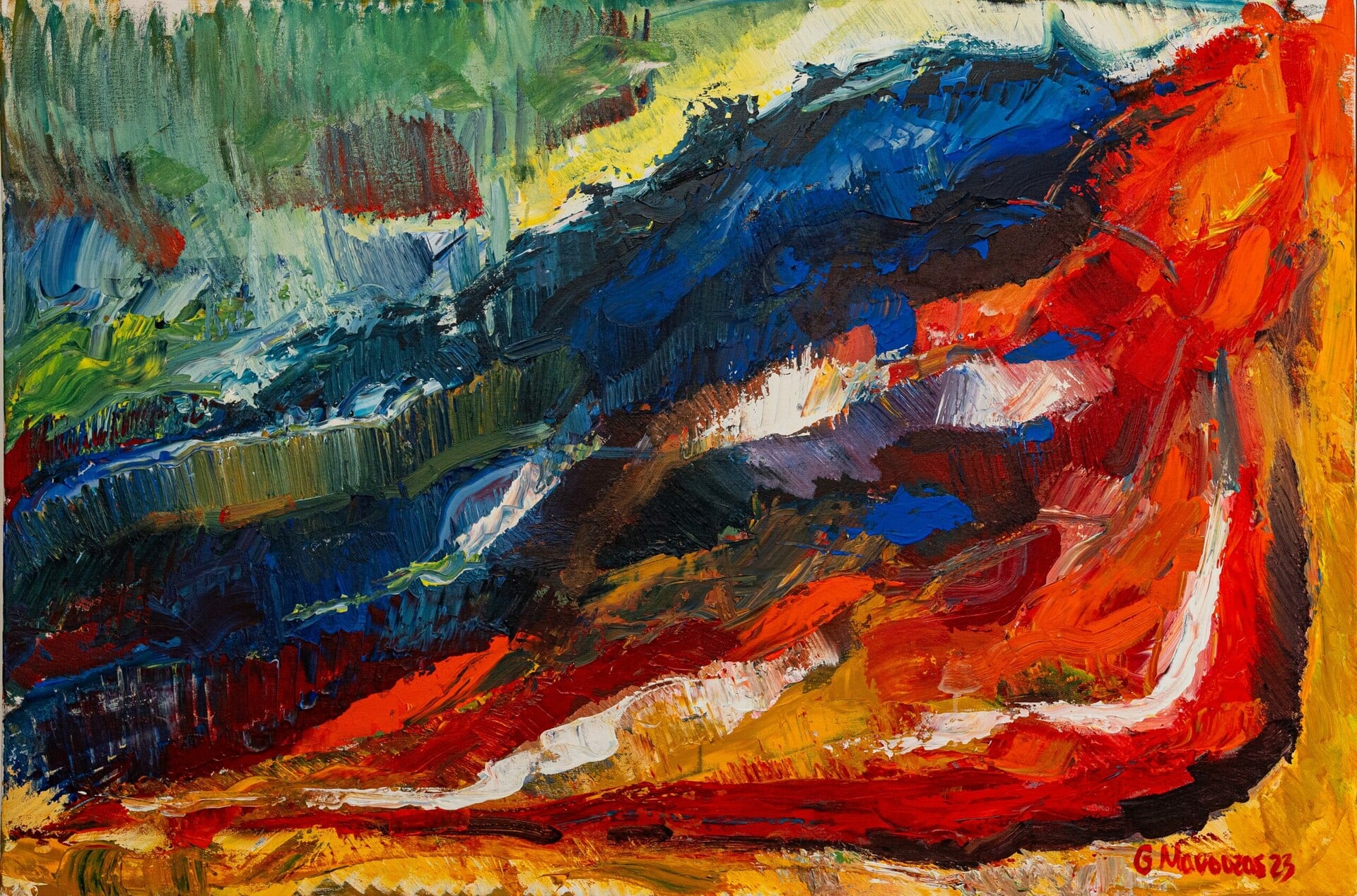 Η έμπνευση του Γιώργου Μανούζα έρχεται κυρίως από τοπία, είτε φυσικά είτε βομηχανικά αστικά, δημιουργώντας συνθέσεις ημί-αφηρημένες και εξπρεσιονιστικές, όχι μόνο έντονα χρωματικές αλλά και ασπρόμαυρες, καθοδηγούμενος από το υποσυνείδητο. Αποτυπώνει στα έργα τα συναισθήματα που ‘αφήνουν’ αυτά τα τοπία, ελευθερώνοντας μνήμες ονειρικών διαδρομών. Ο ίδιος αναφέρει χαρακτηριστικά: ‘’Με ενδιαφέρει η ένταση που δημιουργείται ανάμεσα στη δομή και την αποδόμηση, στο γνώριμο και το ασαφές.’’