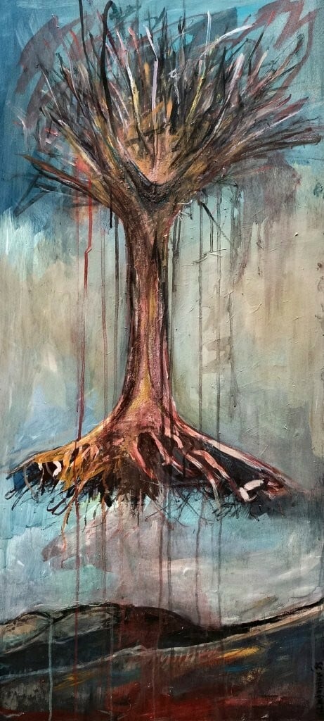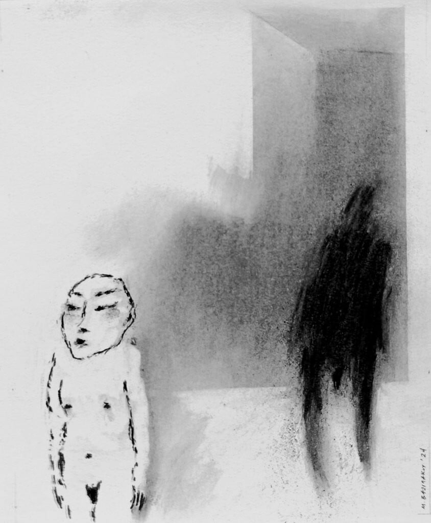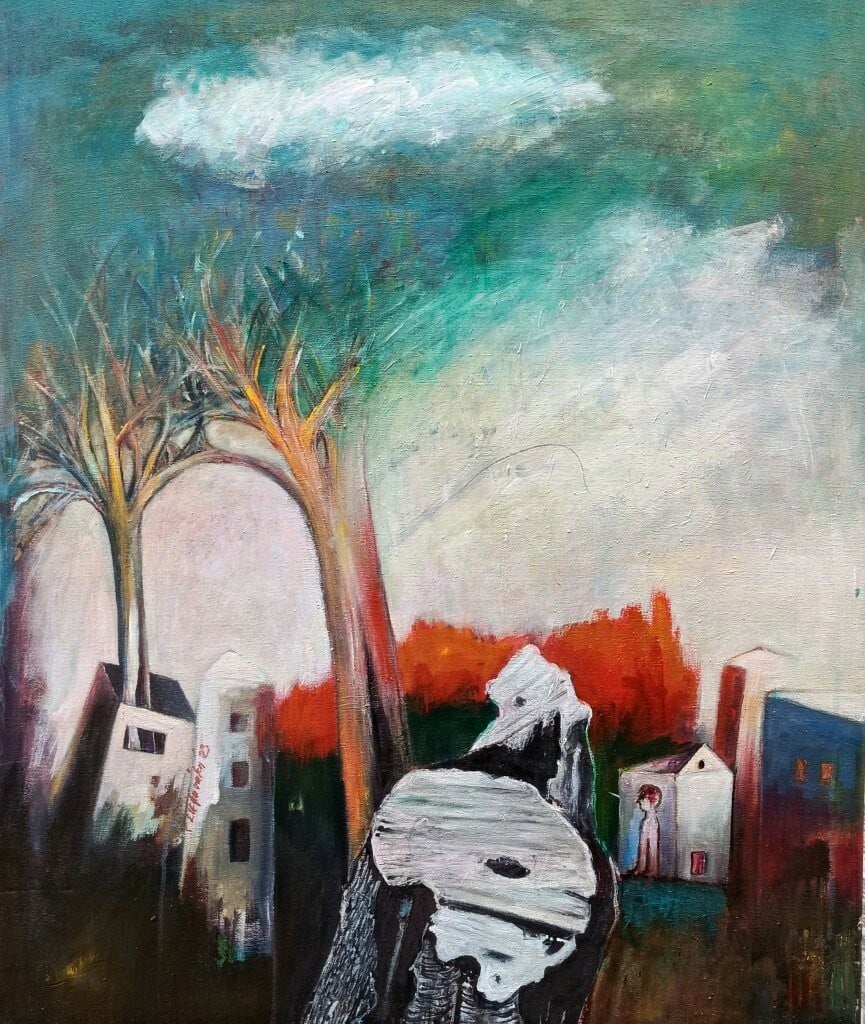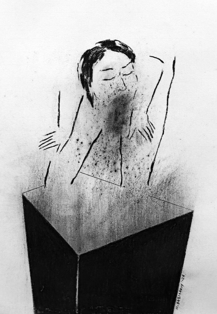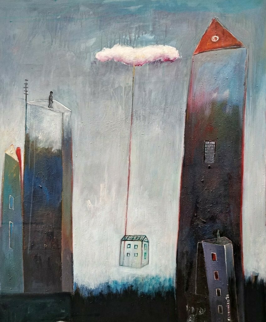 Η Μαργαρίτα Βασιλάκου αναφέρει για την έκθεση : «Η ενότητα αυτή των έργων, με τον γενικό τίτλο «Μεταίχμιο μεταξύ γης και ουρανού», αποτελεί τη συνεργασία μου με τον ποιητή Χρίστο Κρεμνιώτη και συνομιλεί με την ποιητική του συλλογή «Σε σάρκινο χαρτί». Είναι έργα που δημιουργήθηκαν μέσα σε έντονη συναισθηματική φόρτιση και αντικρουόμενα συναισθήματα που κυριάρχησαν μέσα μου. Κυρίως θλίψη και πόνος για την αθωότητα που έχει πληγωθεί, θυμός και αγανάκτηση απέναντι στην αδικία και τη βία, αλλά και μια έντονη αίσθηση της ευθύνης που φέρω ως ζωγράφος.»