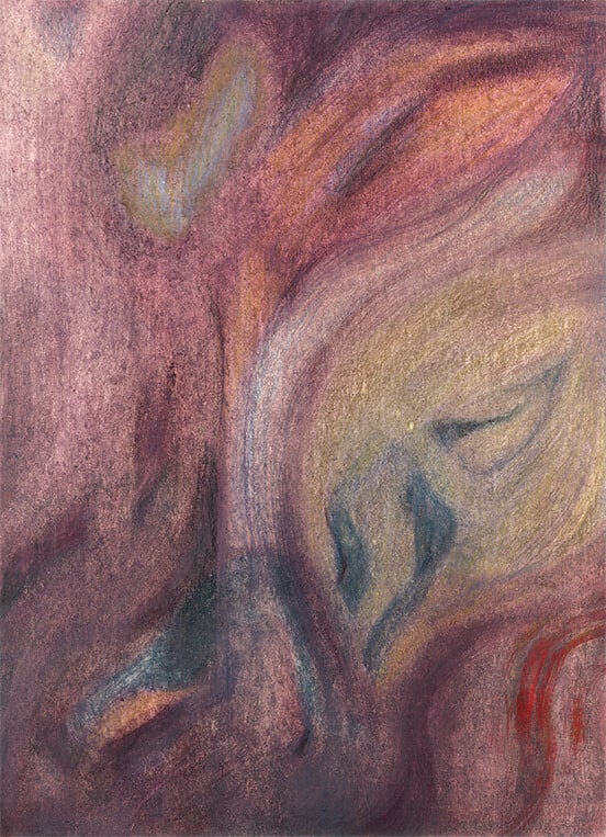 Οι φόρμες και οι χειρονομίες της είναι κυκλικές και προμηνύουν γέννηση. Σαν μια αργή κυοφορία που εξελίσσεται μέσα στην επιφάνεια του έργου. Μορφές που θυμίζουν έμβρυα κρύβονται σε διαφανείς, αμνιακούς κόσμους, έτοιμες να εκκολαφθούν. Αυτή η αίσθηση γένεσης δεν είναι τυχαία, μα αποτελεί οργανικό στοιχείο της σύνθεσής της, η οποία στηρίζεται σε ρυθμικές στριφογυριστές επαναλήψεις και ήπιες μεταβάσεις και μετατονισμούς. Ο ρυθμός της ζωγραφικής της είναι αργός, στοχαστικός, με μια σχεδόν τελετουργική πειθαρχία. Θυμίζει ηπειρώτικο μακρόσυρτο χορό, επαναληπτικό, βαθύ, γεμάτο σιωπηλή συγκίνηση.