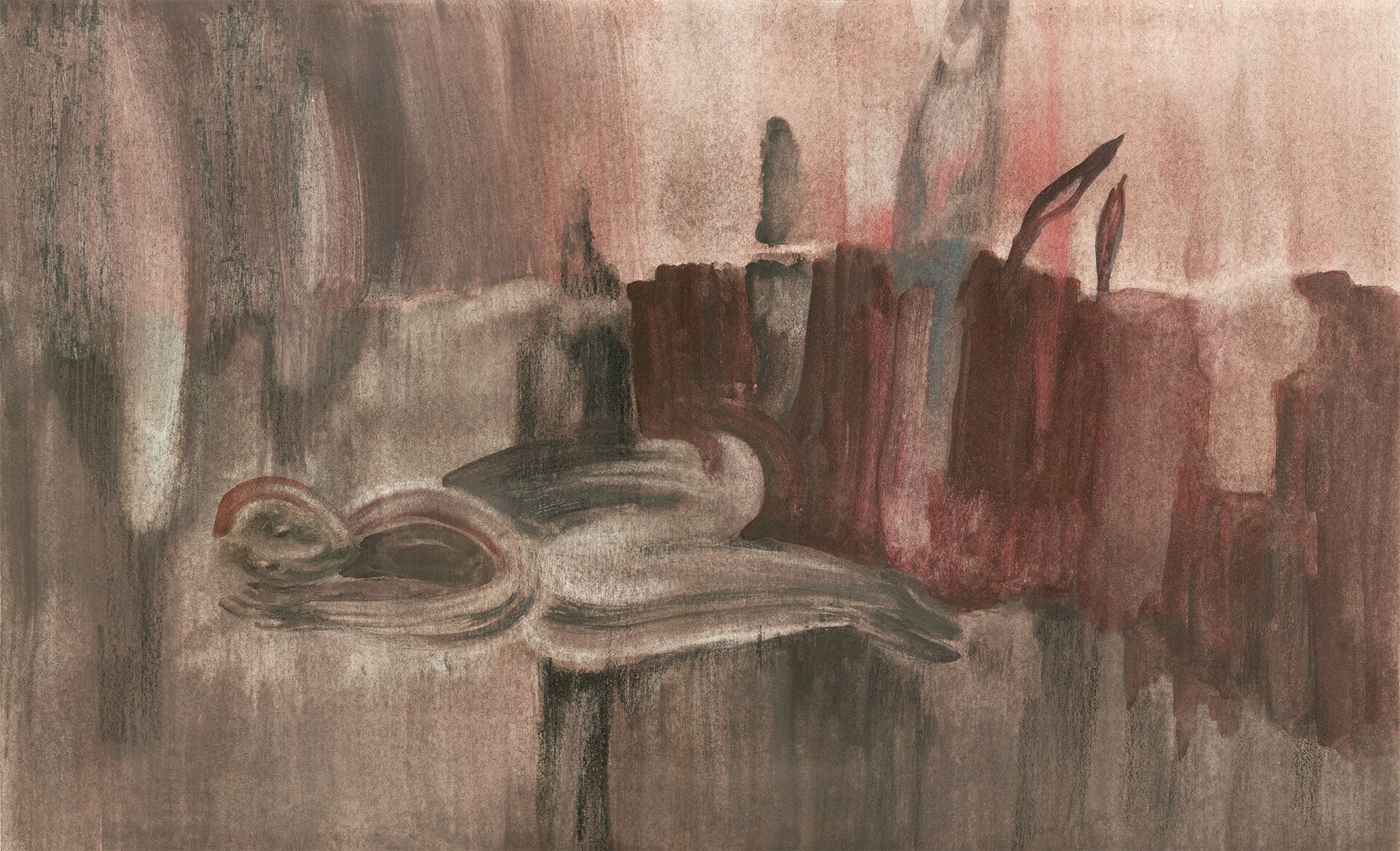 Αυτό που βλέπει κανείς στα έργα της Μαρίας Χαραλάμπους δεν είναι απλώς τοπία, αλλά ονειρικοί κόσμοι, κατοικημένοι από αέρινες φιγούρες και αόρατες αναπνοές. Τα έργα της μοιάζουν να αιωρούνται ανάμεσα στο πραγματικό και στο φανταστικό, δημιουργώντας μια αίσθηση αλλόκοσμης ηρεμίας. Η Μαρία, αξιοποιώντας την τεχνική της γκουάς και της ακουαρέλας, χειρίζεται το υλικό της με τρόπο που επιτρέπει στο νερό να γίνει φορέας νοήματος και την ύλη με τρόπο που μιμείται τις αισθήσεις. Οι φόρμες της ρευστές, παραμένουν σε κίνηση, ανασαίνουν, κυλούν απαλά, σαν να γλιστρούν μέσα στο φως, αρνούμενες να αποκρυσταλλωθούν.