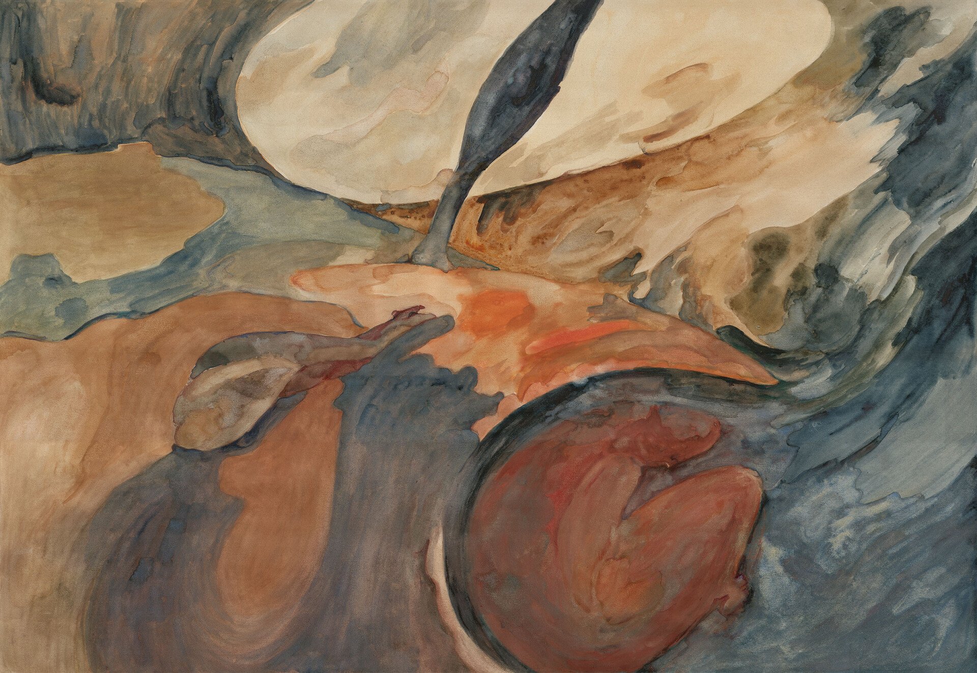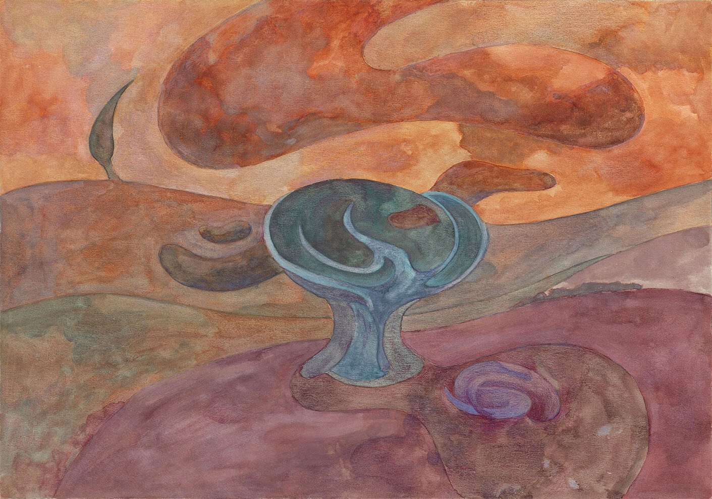 Κι όμως, αυτή η ρευστότητα δεν μένει άυλη. Το υδάτινο στοιχείο συναντά τη γη με τρόπο που θυμίζει λάσπη ή χώμα, ίσως και την πάχνη που αφήνει η πρωινή δροσιά μετά την καταιγίδα. Η ζωγραφική της δεν είναι μόνο συνειρμική, είναι και απτή. Δύο στοιχεία, νερό και γη, συνυπάρχουν παραδόξως, δημιουργώντας έναν τόπο τόσο υλικό όσο και συναισθηματικό μαζί, έναν κόσμο όπου η ύλη γίνεται εμπειρία, και η εμπειρία αφήνει σημάδι. Σαν την εικόνα μιας λίμνης που καθρεφτίζει τον ουρανό και ταυτόχρονα κρύβει μέσα της τη γη, συγκεντρώνοντας ακριβώς αυτά τα συστατικά της ύπαρξης, το ουράνιο, το υδάτινο αλλά και τον αιθέρα, σε μια εύθραυστη, ευθυγραμμισμένη και συνάμα γαλήνια ισορροπία.