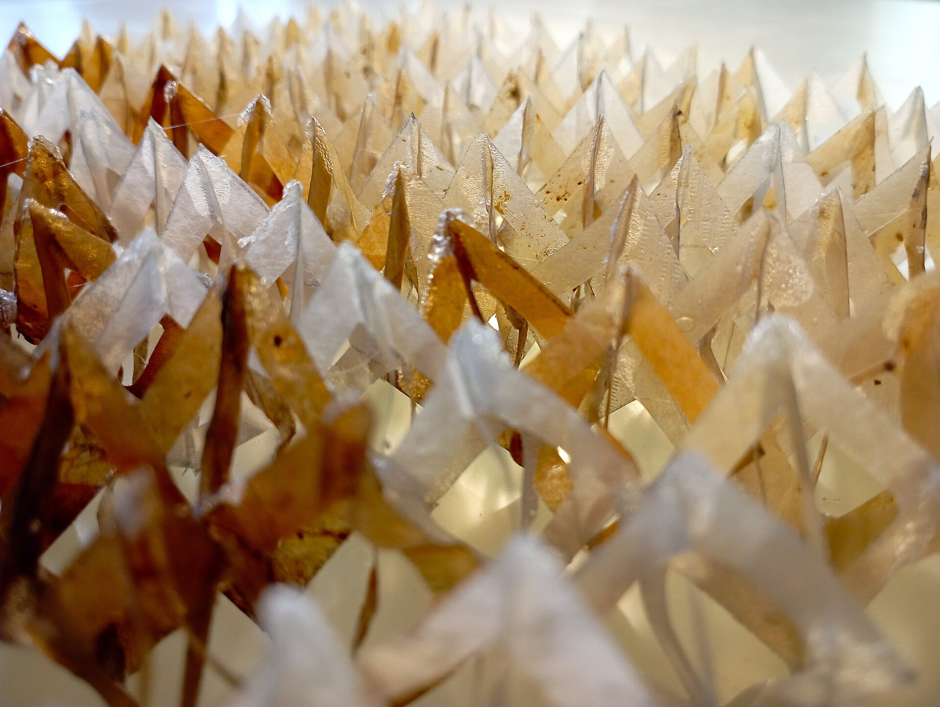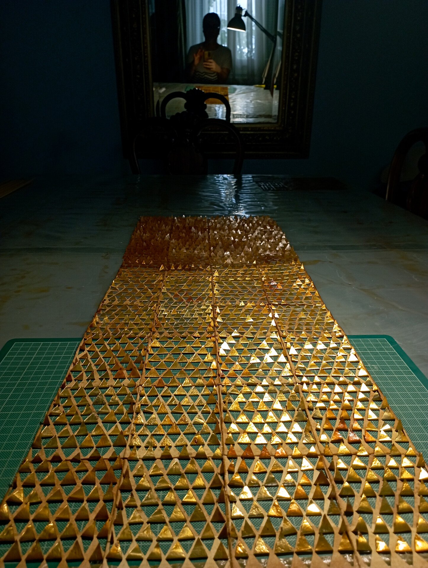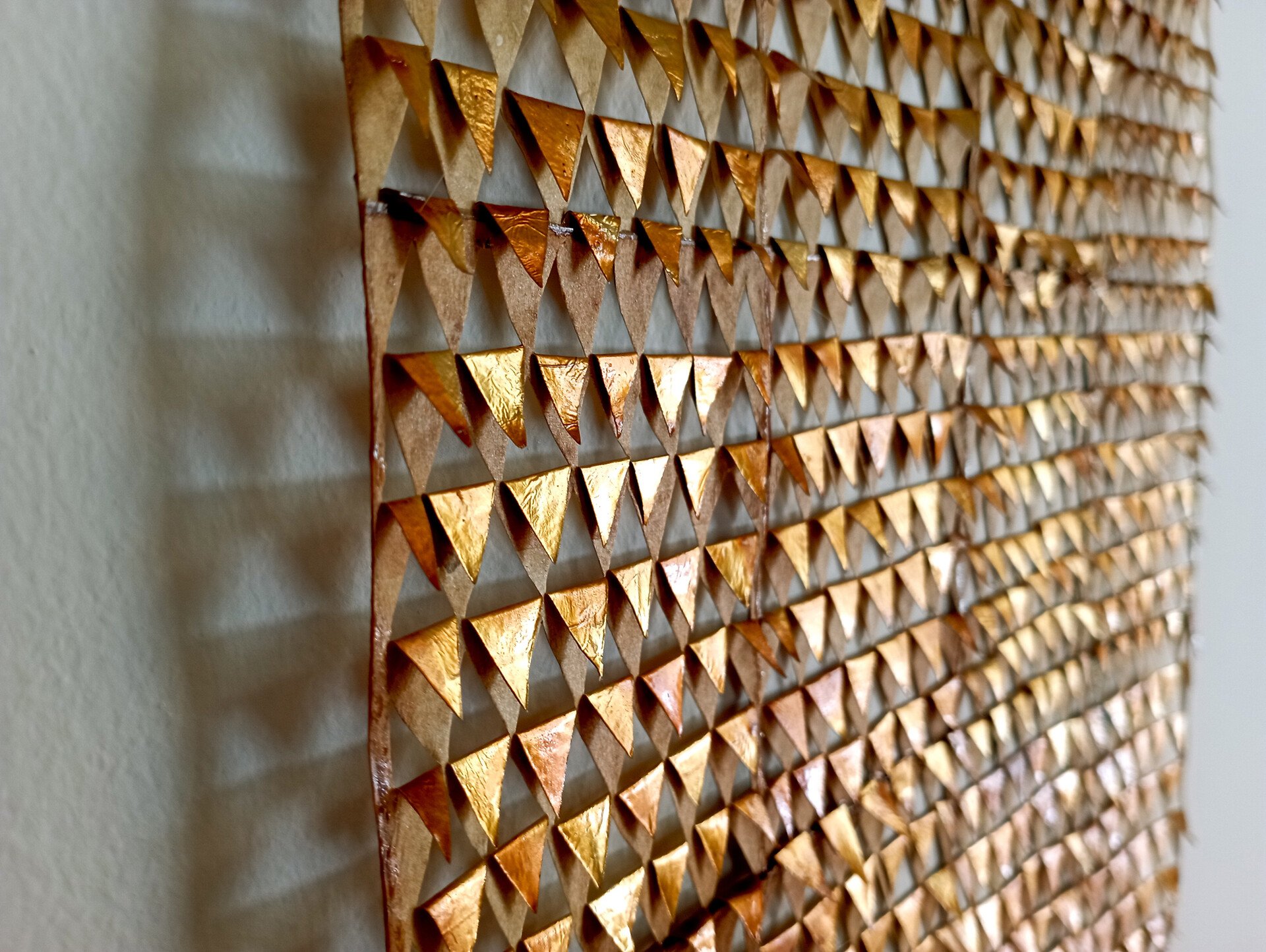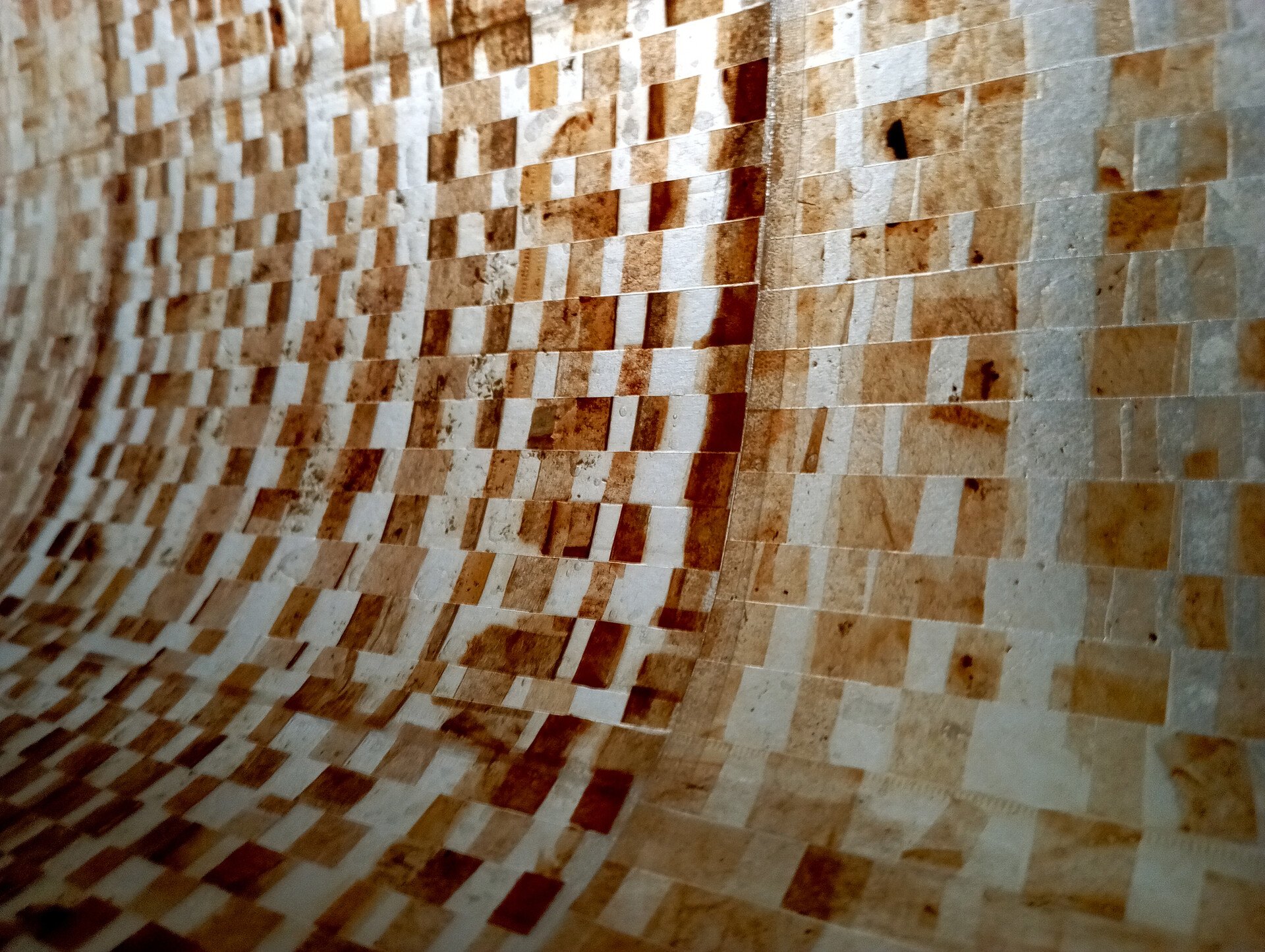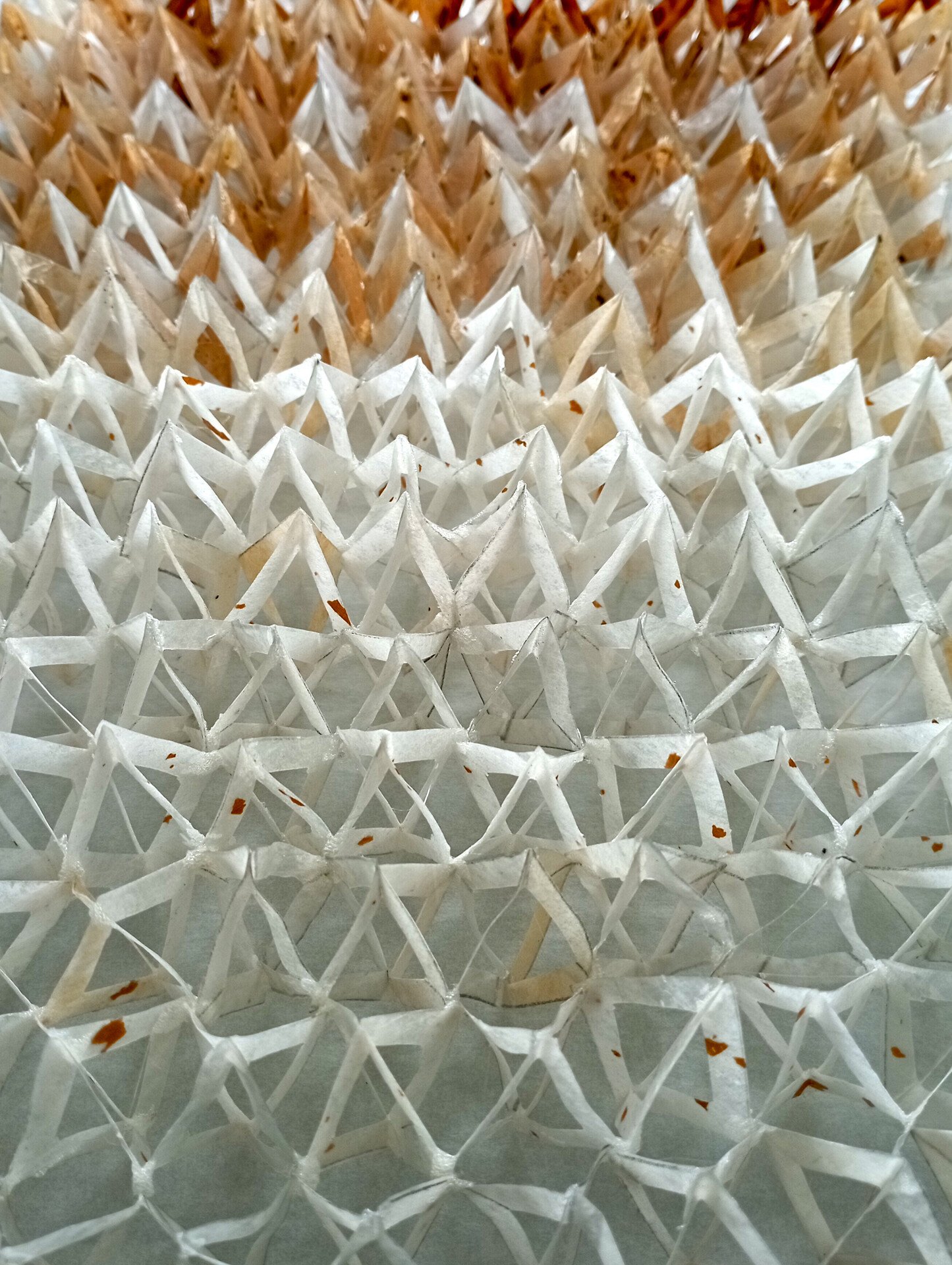 Τα μοτίβα και οι υφές μοιάζουν με οικοδομήματα-κελύφη ή τοπία-επιδερμίδες, ιδιότυπους εύθραυστους χώρους. Τα λεπτεπίλεπτα και ευαίσθητα περιβάλλοντα εμπλέκονται, υφαίνονται και διατάσσονται στον χώρο στον οποίο και αποδίδουν εξωπραγματική διάσταση. Μέσα σε ένα κομμάτι χαρτί, συντίθενται η προσωπική και η συλλογική εμπειρία. Η ανάπλαση ανασύρει πολλαπλές μνήμες και παράγει πολλαπλές αναγνώσεις.